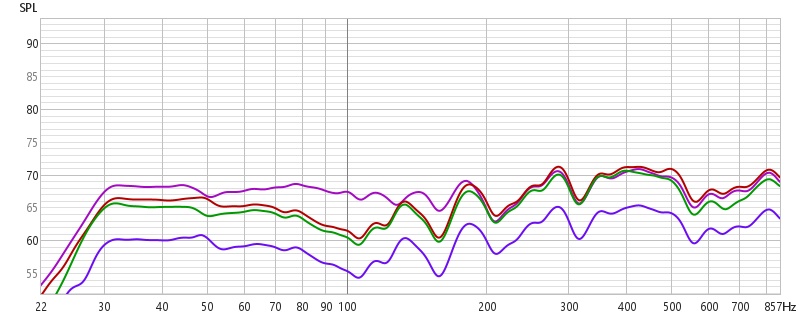 Wie man unschwer erkennen kann, sind die beiden Messungen in Grün und Gelb oberhalb unserer lilanen Referenz. Der Bass wird angehoben.