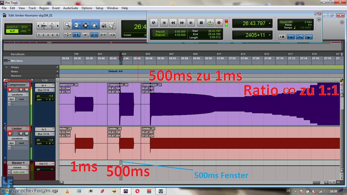Vorne 1ms, danach 500ms. oben der RMS (Falsch gekennzeichnet im Bild) und unten der Limiter.