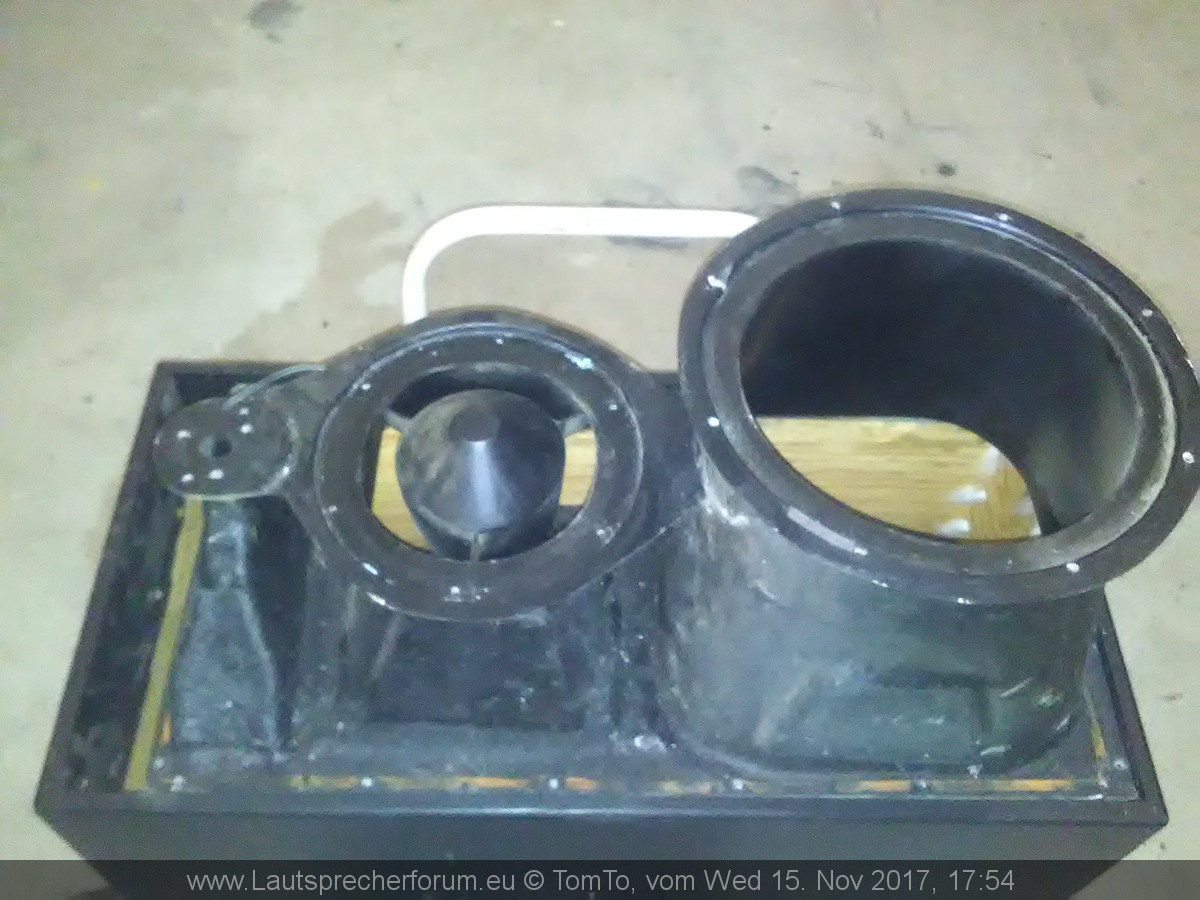 Dies hängt von Haus aus nicht nur an einem Hornflare mit etwa 30cm Länge und 50cm Breite, sondern besitzt noch einen kleinen BR Port unterhalb des GFK Horns.