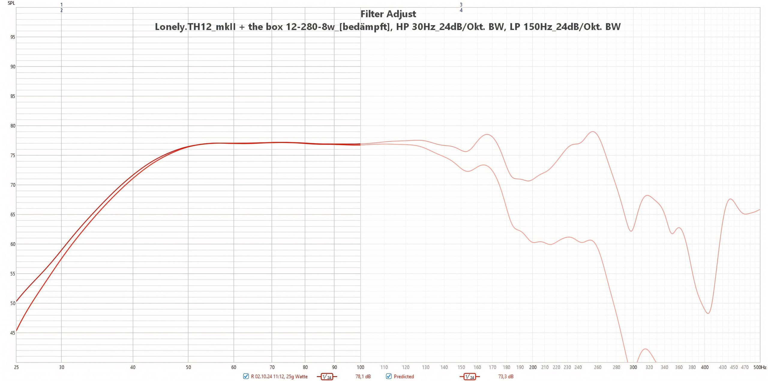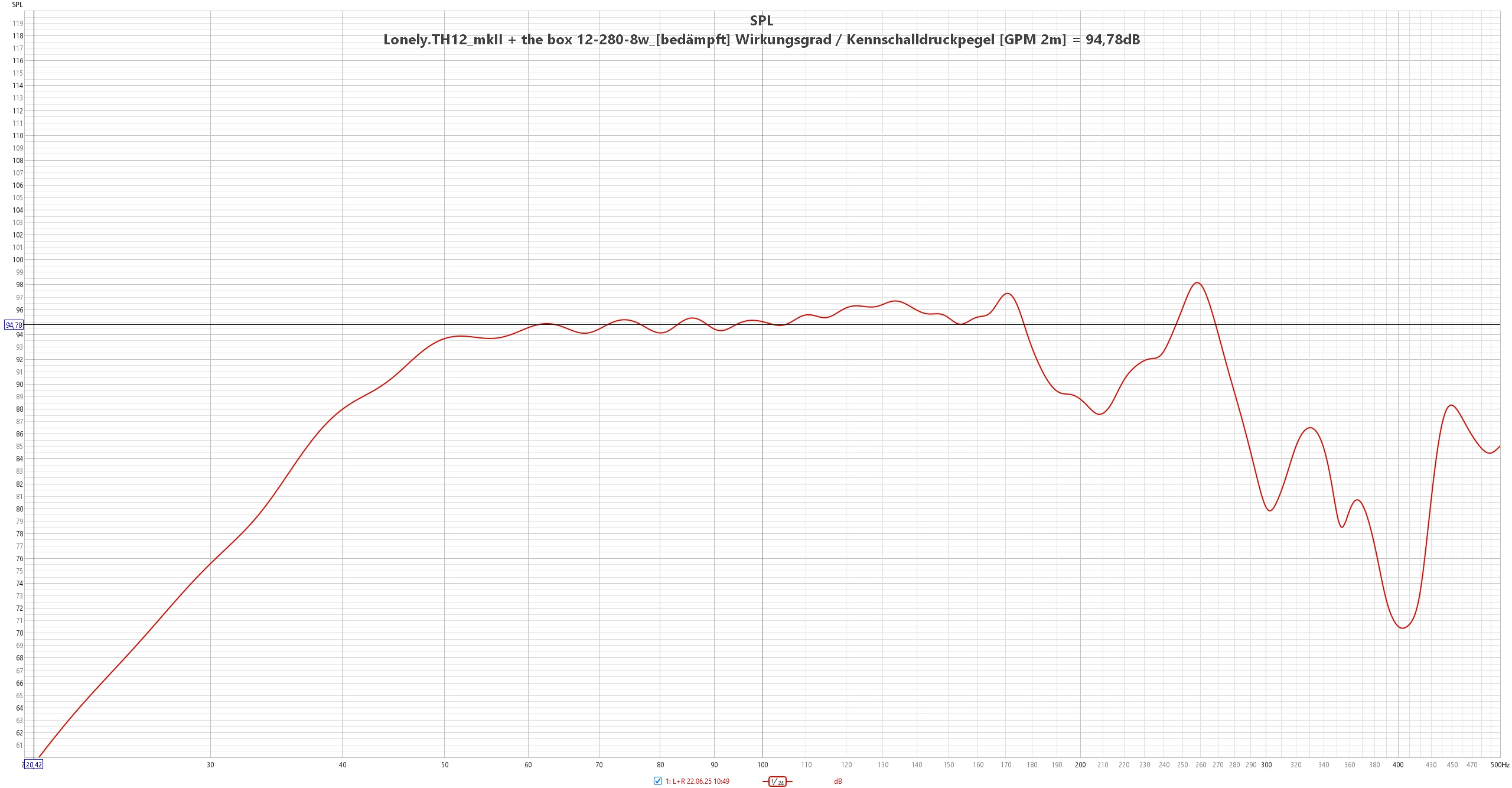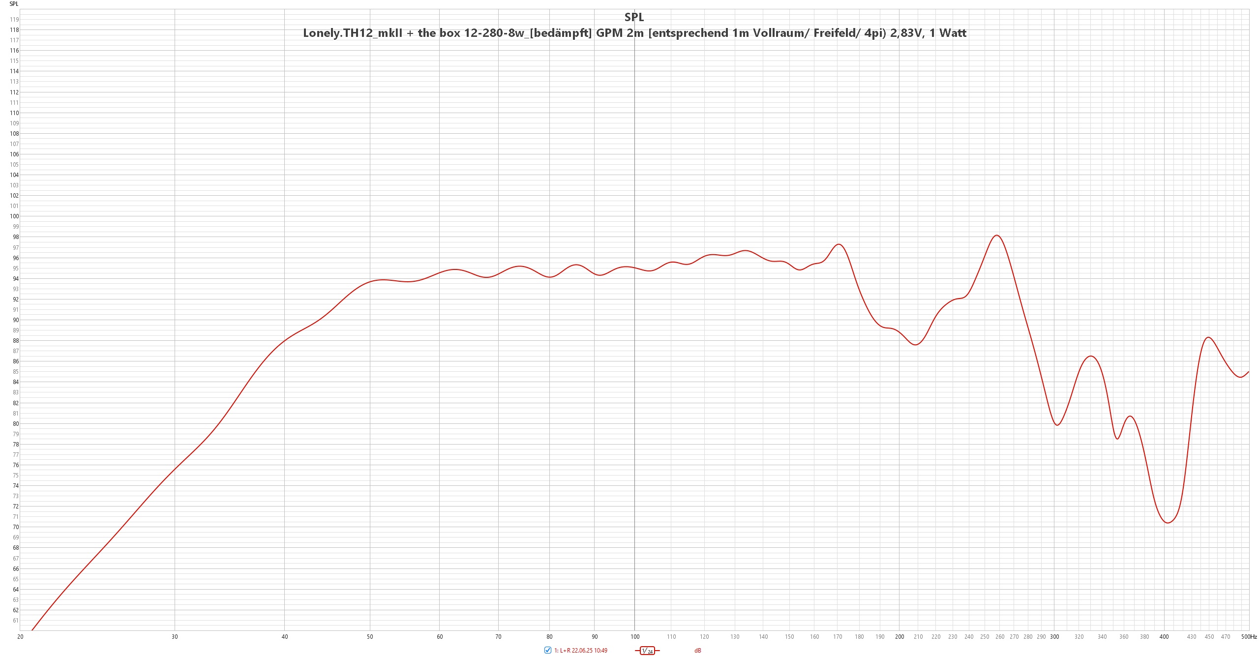 Ich weiss nicht ob ihr euch noch erinnern könnt, aber die Sache mit der Bedämpfung hat einen folgenden Hintergrund. Als ich den ersten Lonely.TH12 entwickelt habe, war der primäre Gedanke zum einen dem MTH-30 den Platz an der Sonne streitig zu machen und zum anderen für die AKKU-Jungs mit ihren Soundboksen einen möglichst kompakten und höchst effizienten Subwoofer drunter zu stellen. Denn Akkulaufzeit und Wirkungsgrad gehen quasi Hand in Hand. Da die AKKU-Jungs aber häufig Car-Hifi Amps verwenden, die nur simple und stumpfe 12dB/Okt. Weichen an Board haben, müsste ich als Entwickler an diesem Punkt reagieren, um eine flache Trennung von 12dB/Okt. zu ermöglichen. Daher der Trick mit der Bedämpfung. Leider musste ich mit der Bedämpfung in der Performance gewisse Zugeständnisse eingehen, weil die Bedämpfung sehr breitbandig wirkt und am Tiefbass ordentlich knabbert.