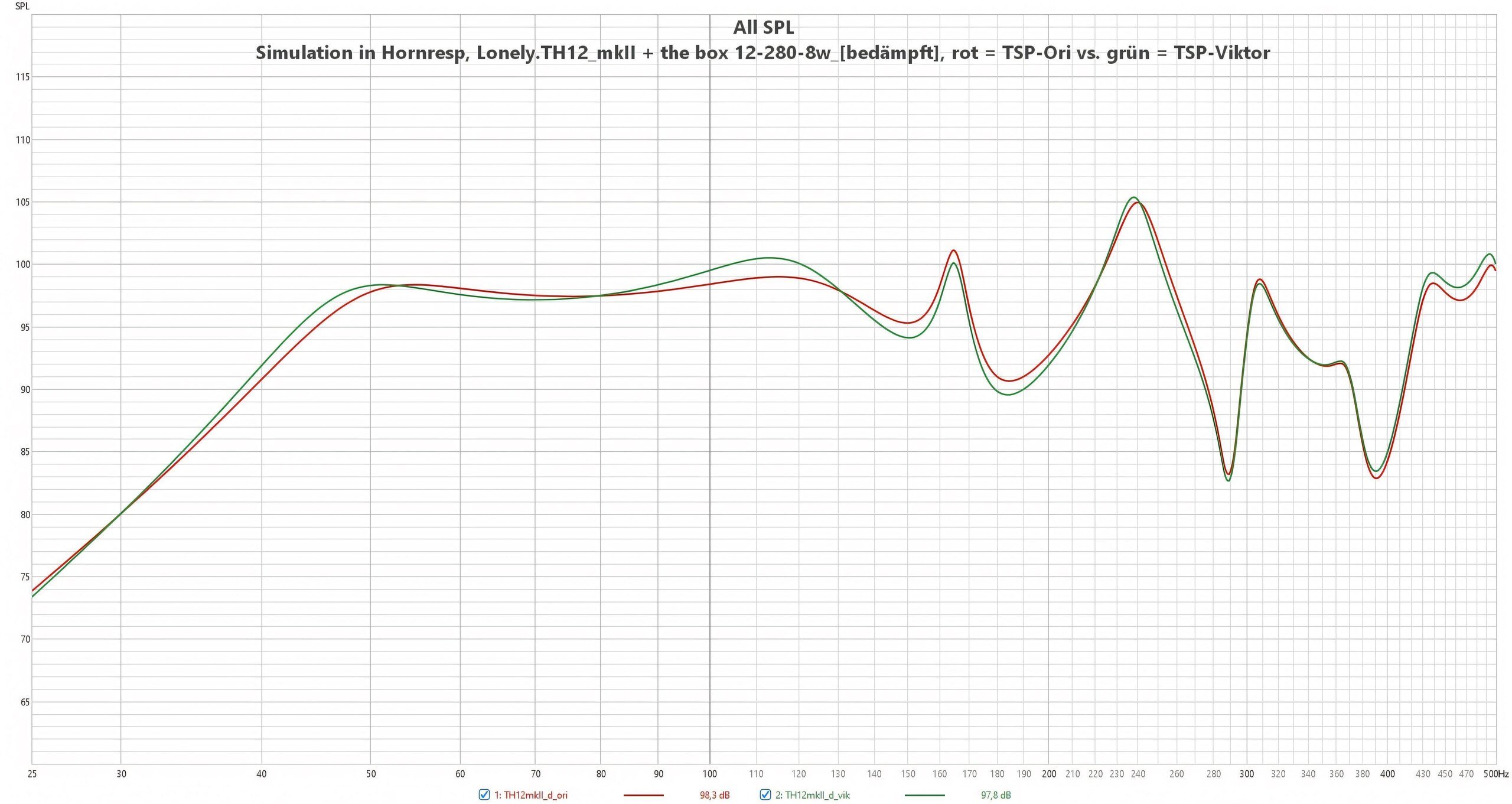 Simulation in Hornresp, Lonely.TH12_mkII + the box 12-280-8w_[bedämpft], rot = TSP-Ori  vs. grün = TSP-Viktor.jpg