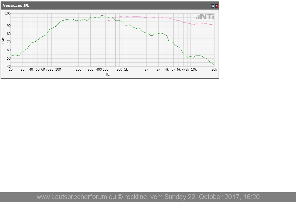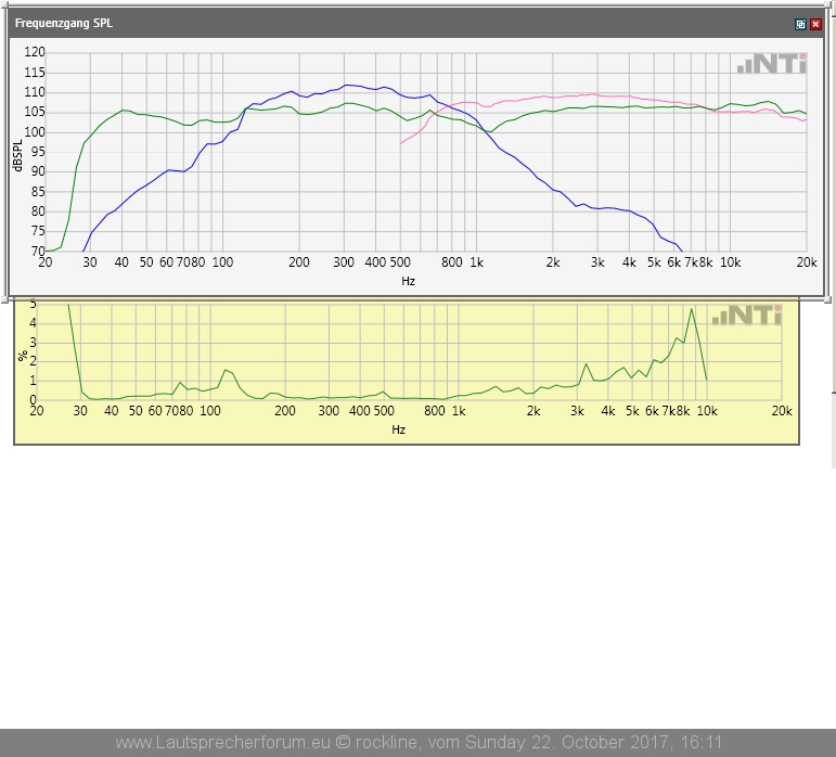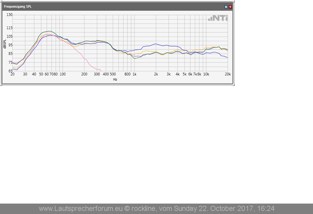 Zuerst mal das grundsätzliche Thema: das ist alles nicht im schalltoten Messraum gemessen! Also nicht überbewerten und mit Messungen aus dem PP vergleichen. Messanalyzer war ein NTi FX100 mit einem Isemcon Mikrofon. Die SPL Kalibrierung ist korrekt.