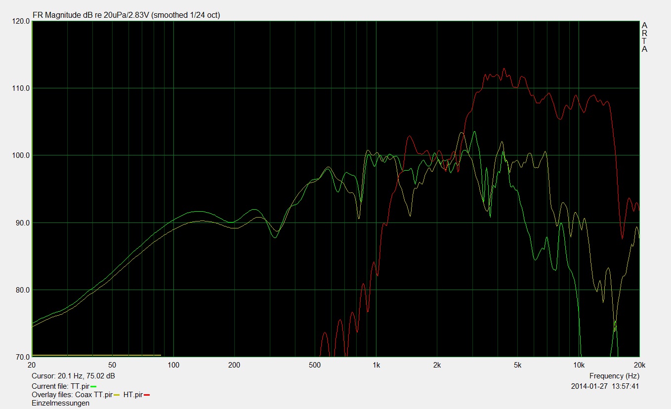 - Super Frequenzgang im Datenblatt, HT laut Angabe ziemlich tief trennbar, was bei Coax nun aber kein so großes Argument sein sollte.