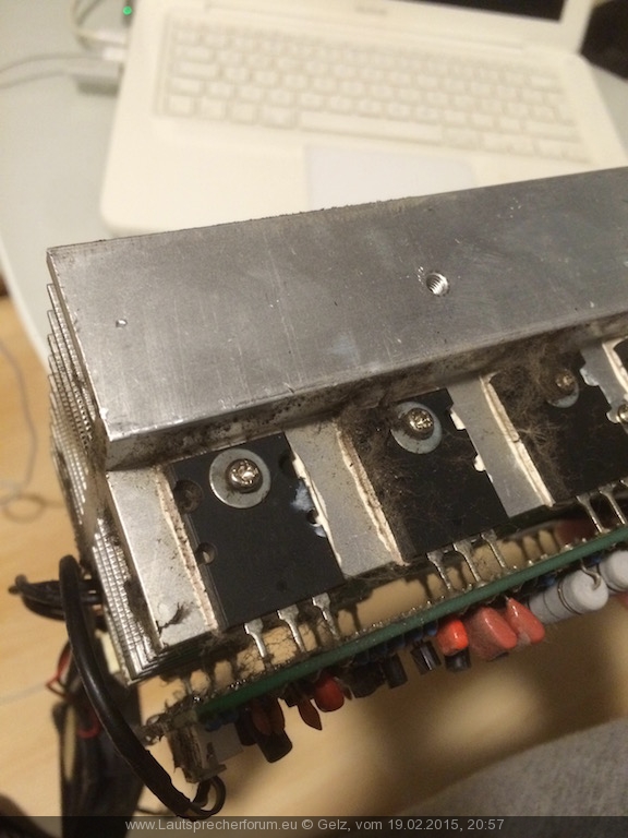 Naja Endstufe aufgeschraubt. Die Platinen sind alle leicht verölt und mit Staub benetzt. ( Dummerweise stand bei der letzten Party die Nebelmaschine direkt neben dem Case :cry: )