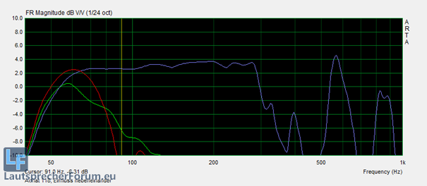 Blau: Ohne HP/TP mit EQ, Grün: HP+TP (45Hz But18, 119Hz LR12), Rot: Gleich wie grün aber mit Kickfill nebendran (angeschlossen an Amp)