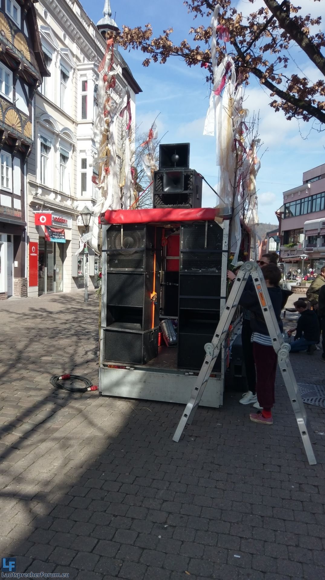Seitens des Ordnungsamts gab es eine Auflage von 95dBA / 5m Abstand zum Wagen. Das ist - gerade in Hinblick auf die zu beschallende Entfernung - nicht sonderlich viel und ließe sich für eine gleichmäßige Beschallung nur mittels mehrerer Delaywagen egalisieren.