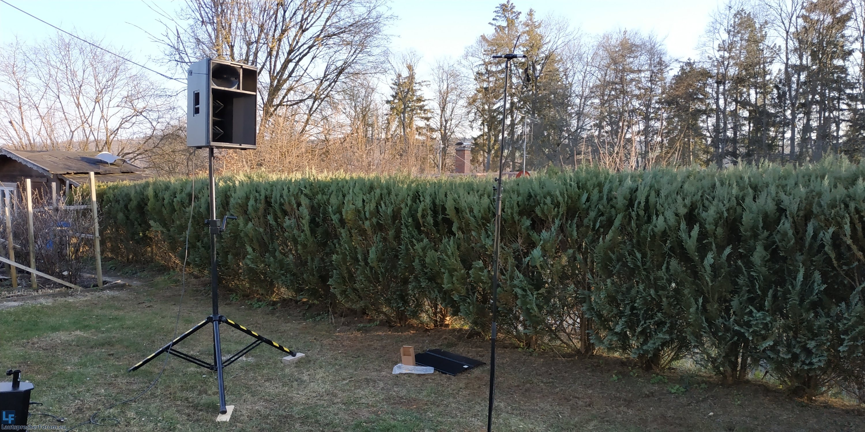 Topteil auf Stativ, 2m Unterkante und Mikrofon in 2m Entfernung auf Höhe zwischen LF+HF. Messmikro war das EMC-40 mit Kalibrierung an einem Behringer UMC Interface.