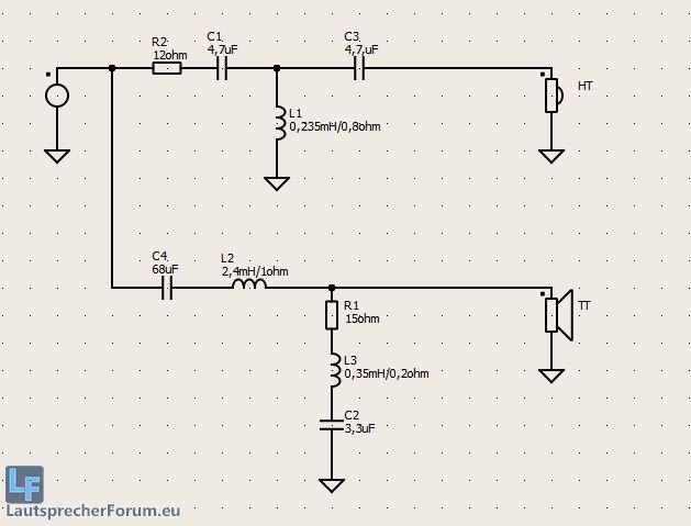 Wär interessant. Hast du eine Vergleichsmessung gemacht?Heini hat geschrieben: ↑30. Mär 2019 22:15 Die LD-Sat 62 hat in Reihe zum TT einen 100uF Cap, der einen Passiven Lowcut darstellt. Der Tieftöner ist nicht wirklich belastbar und wird so vor zu viel Energie im Bass geschützt. Der Hochtöner ist mir um 10kHz deutlich zu laut gewesen, weshalb ich die Weiche etwas modifiziert habe. Ich hoffe, dass ich den Weichenplan noch irgendwo habe.