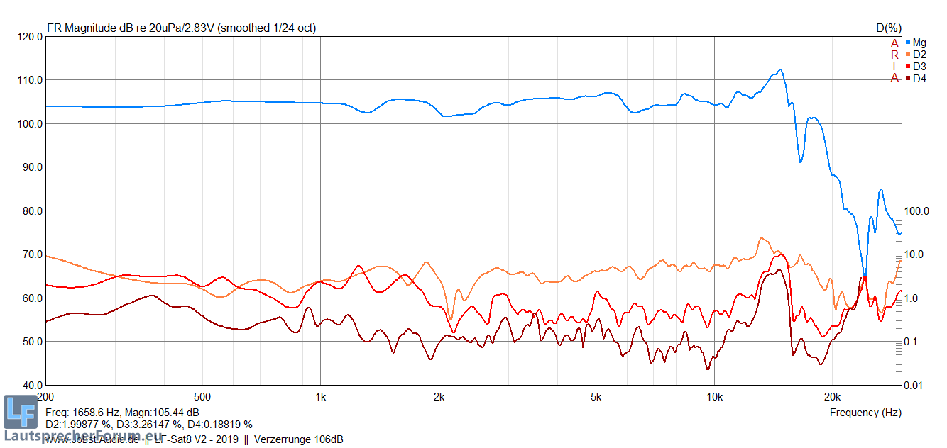 Klirr sagt: Bei knapp Vollgas (106dB) haben wir ein Maximum von 5,5% K3, was ich sehr gut finde. Nur bei 10kHz ist ein kleiner 10% Ausreißer, der aber nicht nervt.
