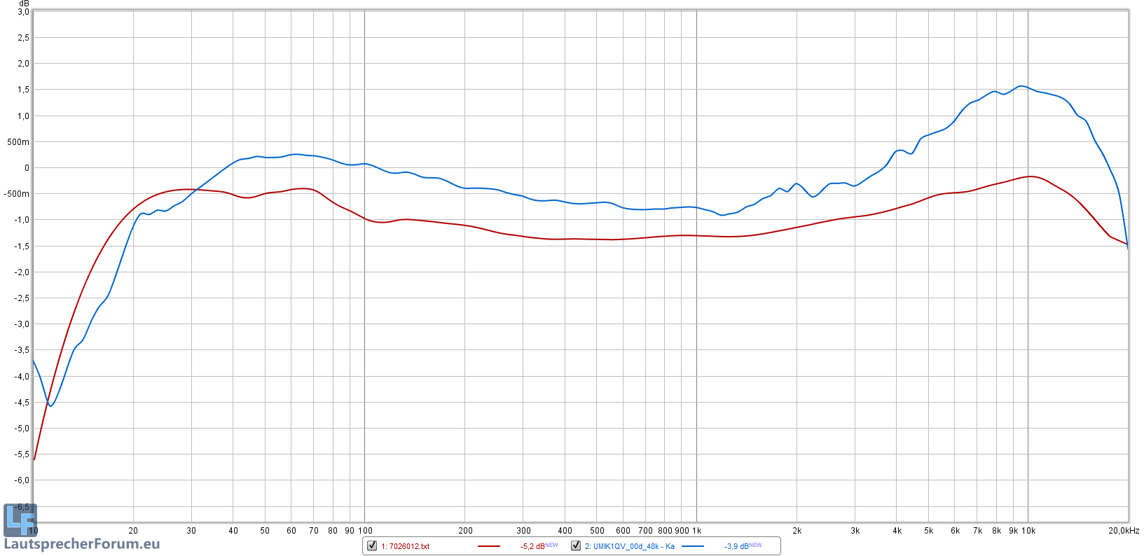 So, mal wieder ein kurzes Update. Mein Mikrofon ist mittlerweile neu Kalibriert, die Empfindlichkeit hat sich um so ca. 0,5dB verändert, hier die alte original Kalibrierung von MiniDSP in Rot, und die neue von Hifi-Selbstbau in Blau.