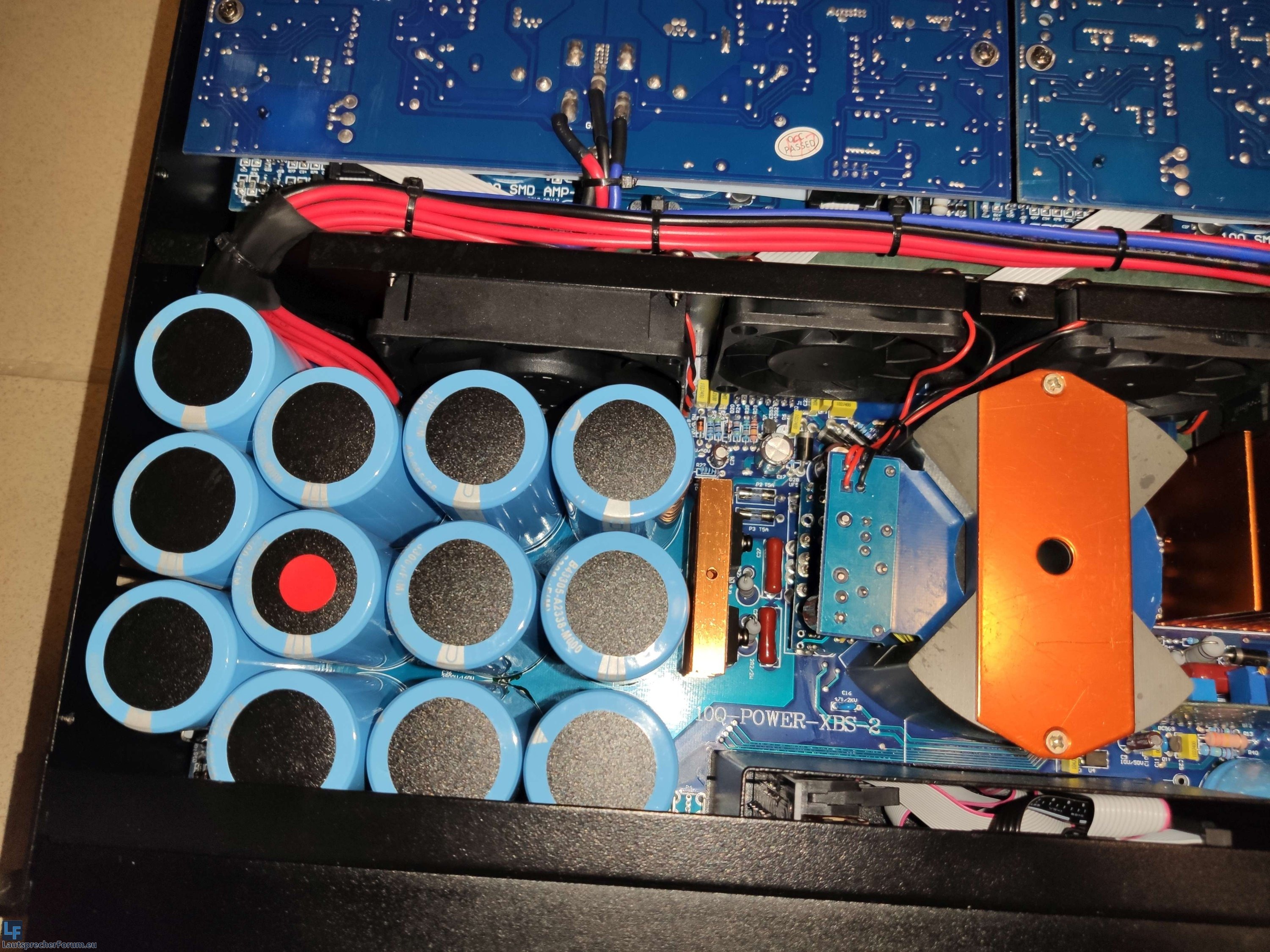 Der erste Tontest zeigt keine Auffälligkeiten. Alles funktioniert problemlos. Die Lüfter der Sinbosen sind aber verglichen mit der Gisen wesentlich lauter. Sinbosen hat im Gegensatz zur Gisen 2 Kondensatoren von EPCOS (also 12x) mit 3300µF (200 V) mehr eingebaut. Auch die Kühlung wurde verlängert und scheint aus Kupfer zu sein (kann ich nicht garantieren). Ob diese Änderungen nun etwas bringen oder nicht sei dahingestellt. Sinbosen verwendet in den Endstufenblöcken ON Semi Transistoren. Die FP14000 erwecken meine 18NLW9601 zu neuem Leben. Diese Leistungsreserven kannte ich bis dahin nicht.