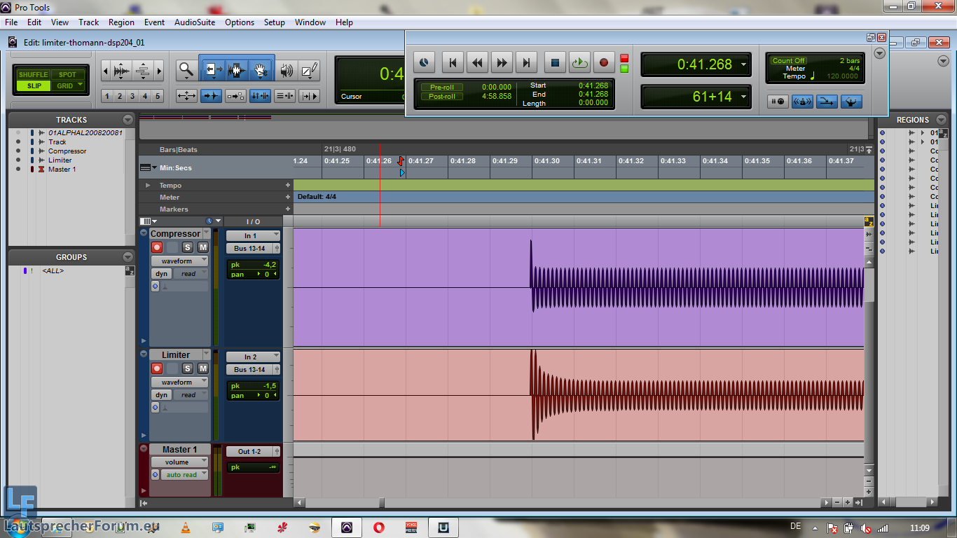 Ich habe den Limiter und Kompressor, mit identischen Settings (1ms/limit/500ms/-6dBu) gegenüber-gestellt,