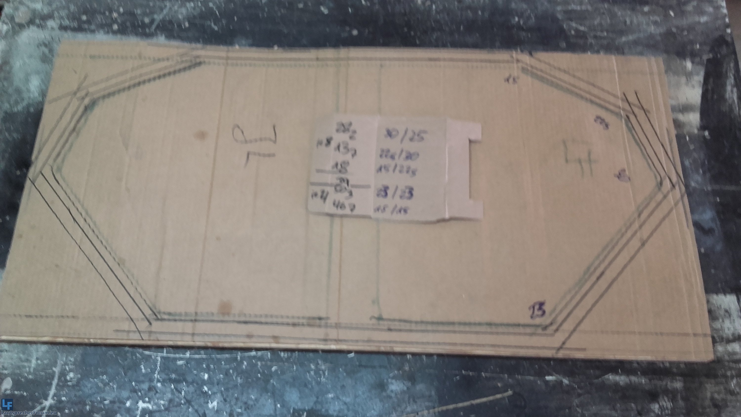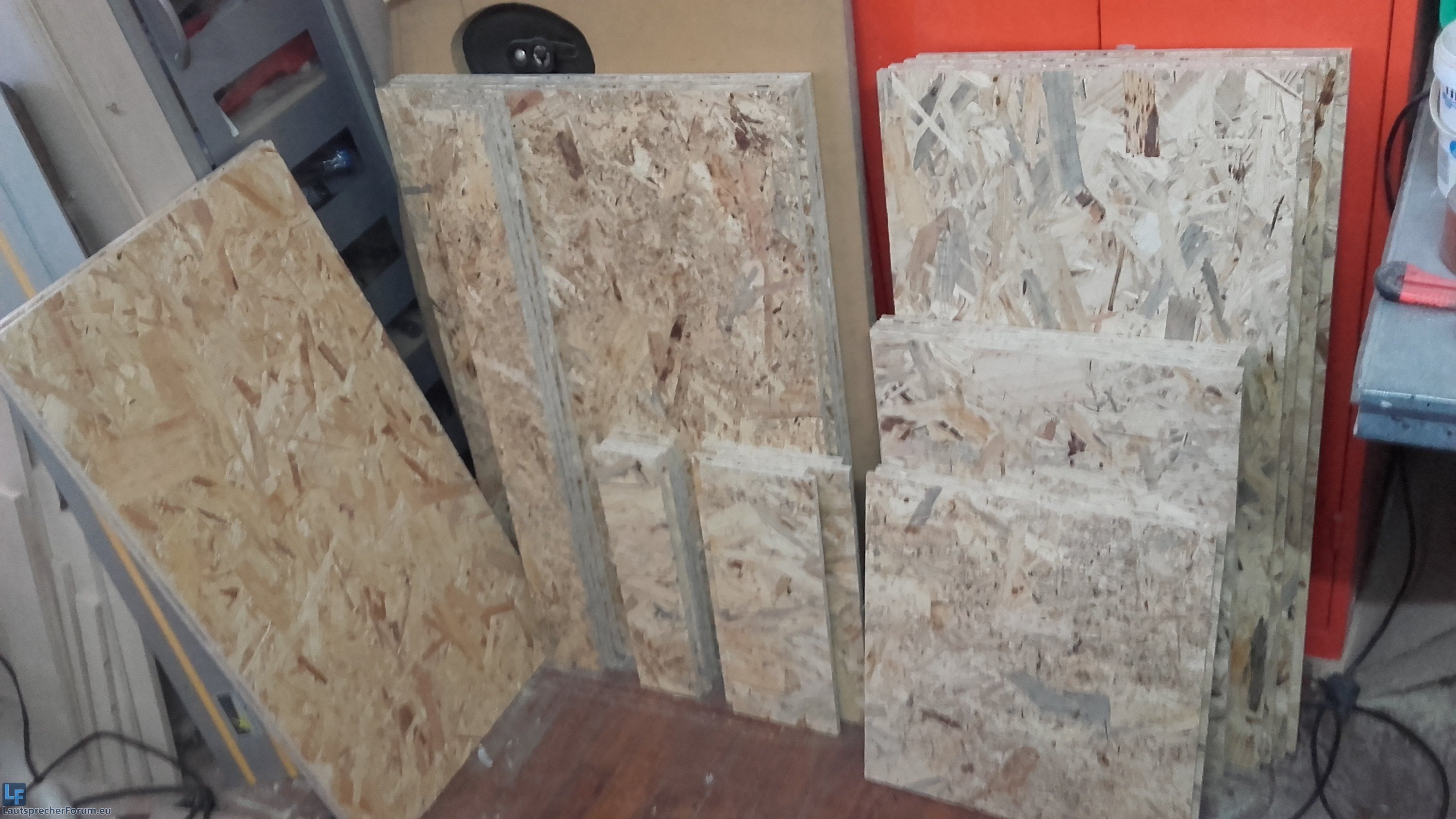 Ergebnis: Aus OSB gefertigte Platten, rundum etwas größer als die Stand/Deckelfläche, damit noch etwas Schaumstoff zwischen Box und umfassender Konturkante hinpasst. Alle Platten wurden etwas abgeschrägt und diese Ecken dann direkt für Griffausschnitte genutzt.