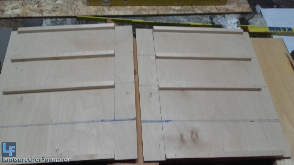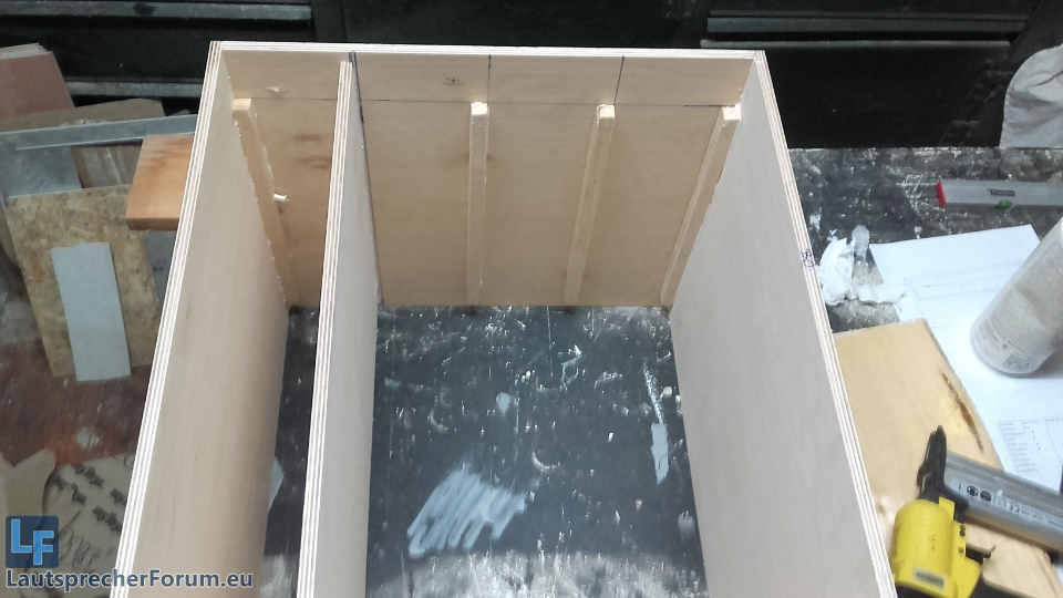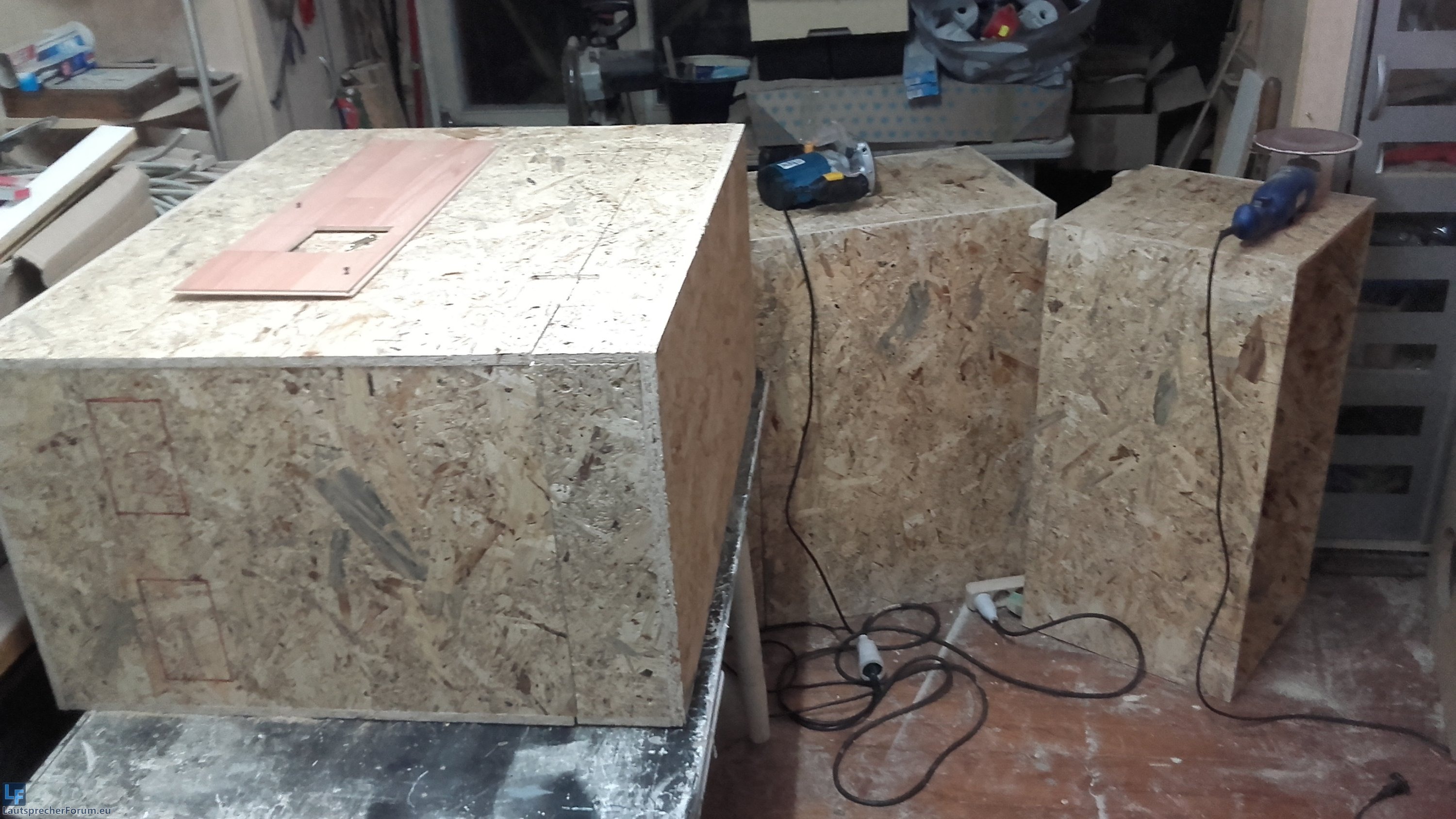Es wurde Samstag schnell mal noch ein Protogehäuse mit versetzbarer Rückwand gebaut, um verschiedene Volumina auszuprobieren. Testvolumina waren etwa 63, 58, 50, 40, 36, 32, 28 Liter.