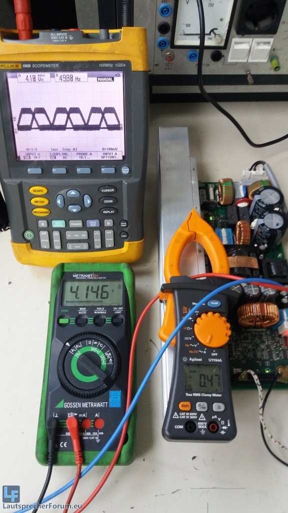 Zu Einstellung, wenn du Flanken triggerst bei nem 100MHz scope, solltest du die Bandbreite limitieren, denn das Trägersignal der class-D Endstufe wird da mit Sicherheit auch noch hinterm Demodulator auf dem Ausgang zu finden sein. Kenne die specs. des Fluke jetzt nicht, kann aber sein das der Trigger sonst sehr nervös wird. Triggerlevel entsprechend anpassen und coupling würde sich hier AC anbieten. Wenn ich das sehe, hast du hoffentlich nicht nur Glück gehabt das dein Oszi isolierte Eingänge hat