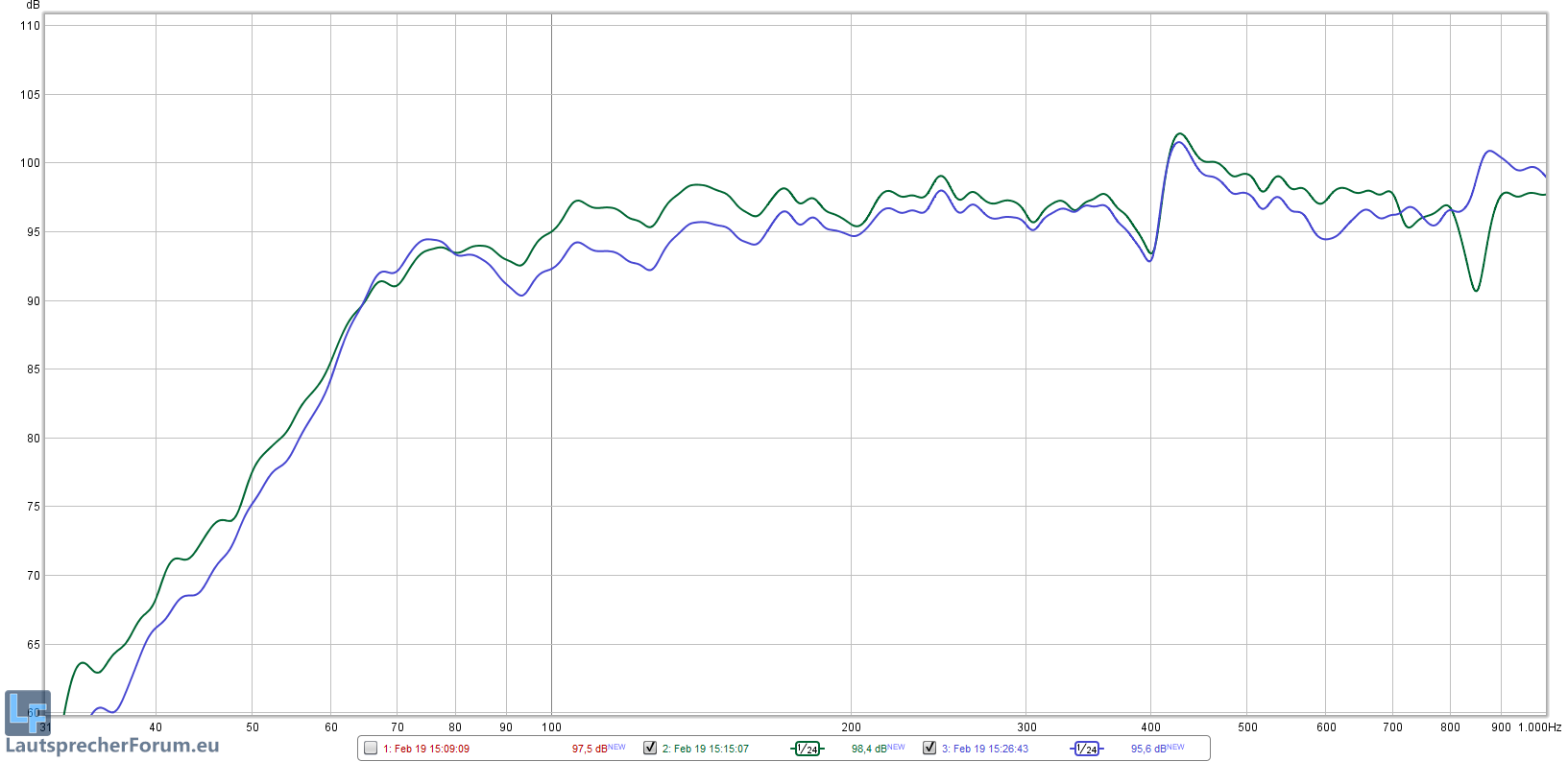 Eine erste Messung habe ich auch schon gemacht, bei der war aber noch kein Dämm-material in der Box, was die Messung vom TMT praktisch unbrauchbar macht. Nächstes Wochenende mache ich, vorausgesetzt das Wetter spielt mit, ne ordentliche Messung samt GPM.