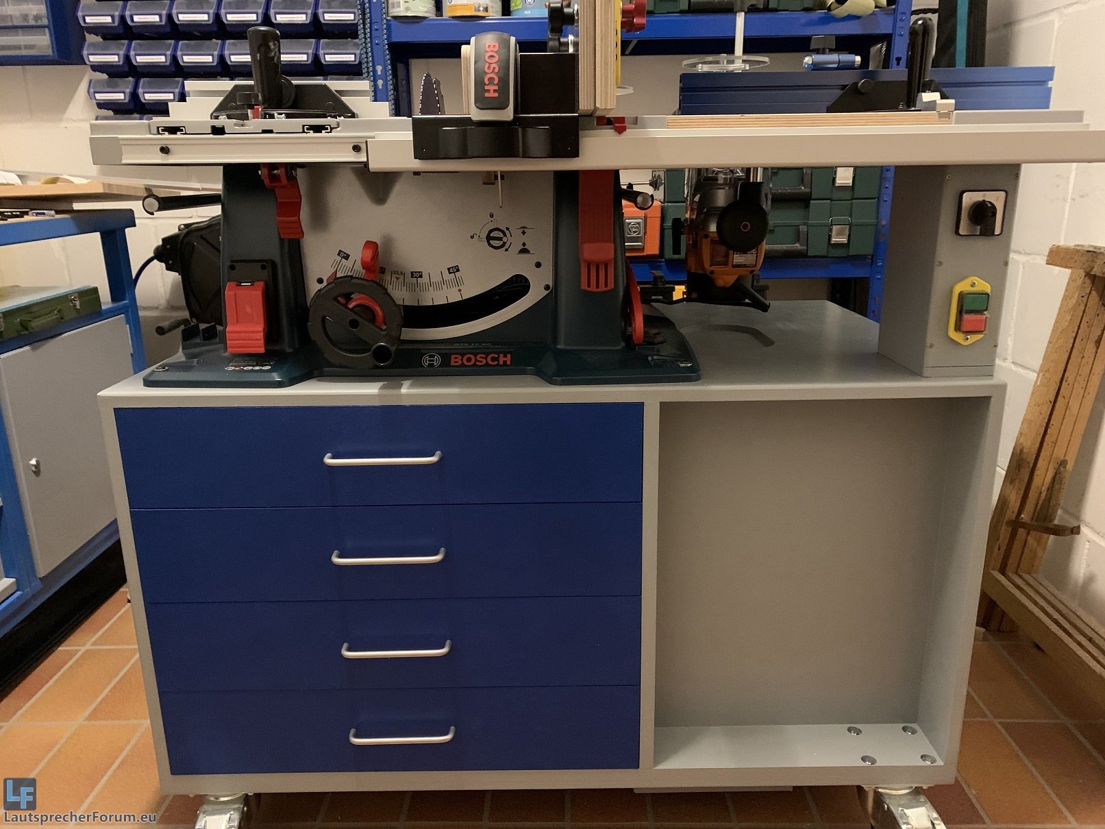 Links kommen noch Schubladen rein, rechts werden noch French Cleats und Werkzeughalter montiert. Es fehlt auch noch der Schutzschalter für die Fräse und der Schalter für die Absaugautomatik, die ganz rechts in einer Säule montiert werden. Die Säule wiederum dient zur Abstützung des Auszuges.