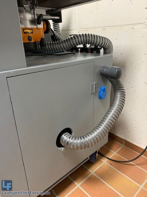 Das Kabinett beherbergt den Staubsauger und eine Slave-Steckdose, die auf einer abnehmbaren Platte montiert ist, um noch an die generelle Verkabelung der Anschaltautomatik zu kommen. Oben rechts am Absaugschacht kommt noch eine Plexiglasplatte hin, um dort evtl. Verstopfungen schnell feststellen zu können.
