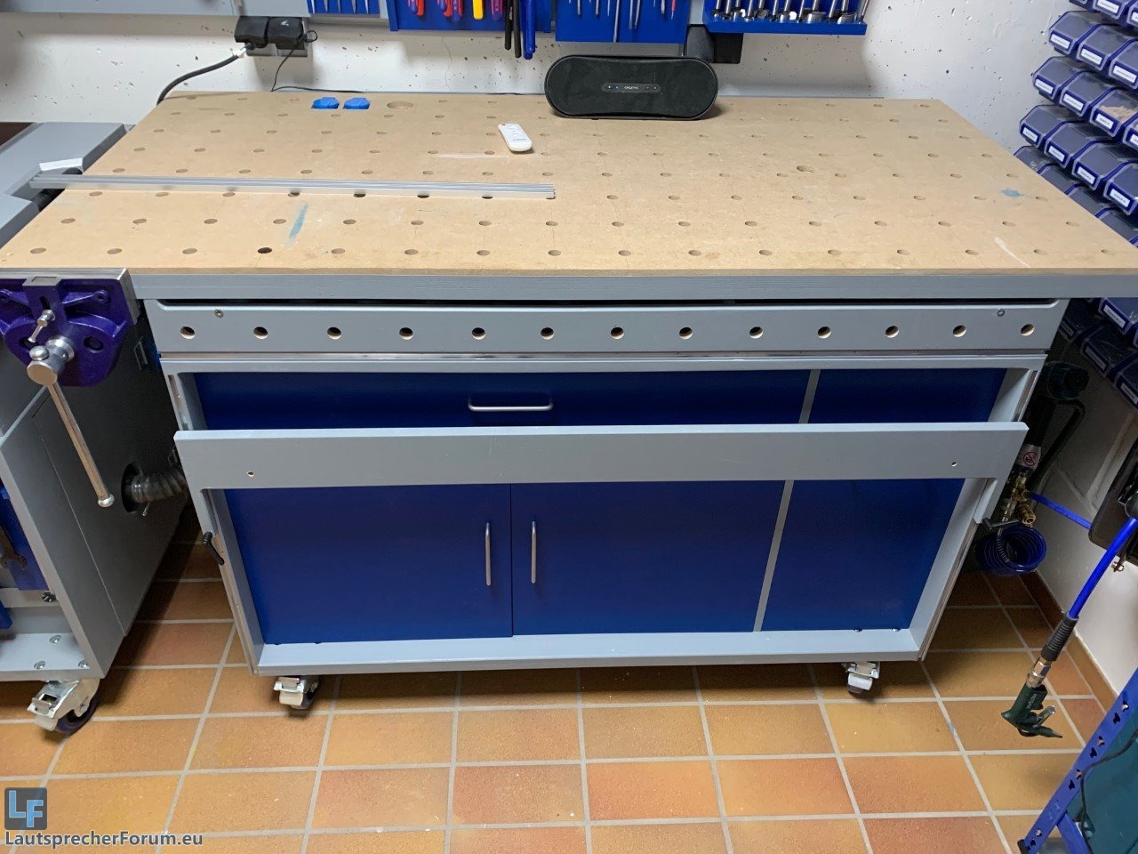 Links kommen noch Schubladen rein, rechts werden noch French Cleats und Werkzeughalter montiert. Es fehlt auch noch der Schutzschalter für die Fräse und der Schalter für die Absaugautomatik, die ganz rechts in einer Säule montiert werden. Die Säule wiederum dient zur Abstützung des Auszuges.