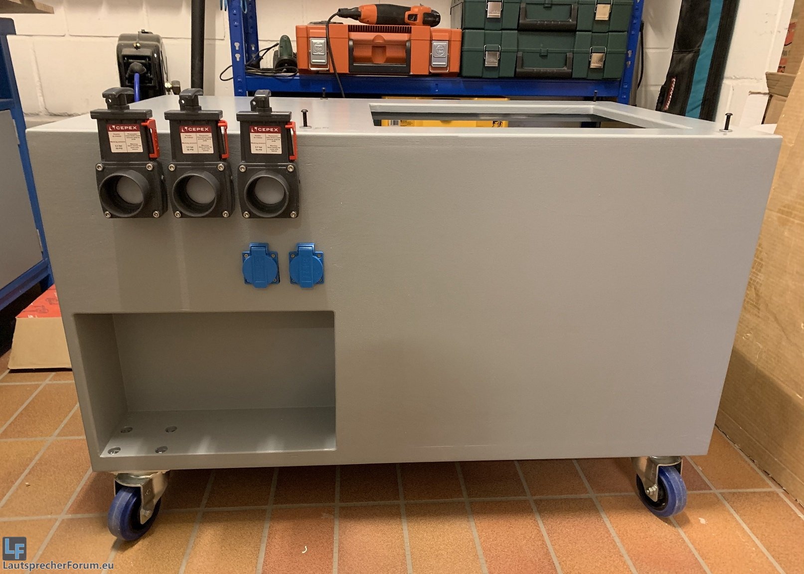 Das Kabinett beherbergt den Staubsauger und eine Slave-Steckdose, die auf einer abnehmbaren Platte montiert ist, um noch an die generelle Verkabelung der Anschaltautomatik zu kommen. Oben rechts am Absaugschacht kommt noch eine Plexiglasplatte hin, um dort evtl. Verstopfungen schnell feststellen zu können.