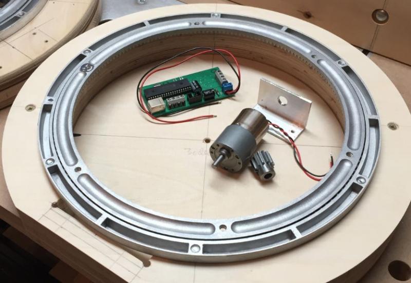 Aufbau des Drehtellers: Ich habe auch den 328mm Drehkranz verwendet. Das passende Zahnrad ist ein Modul 1,5 mit 13 Zähnen.