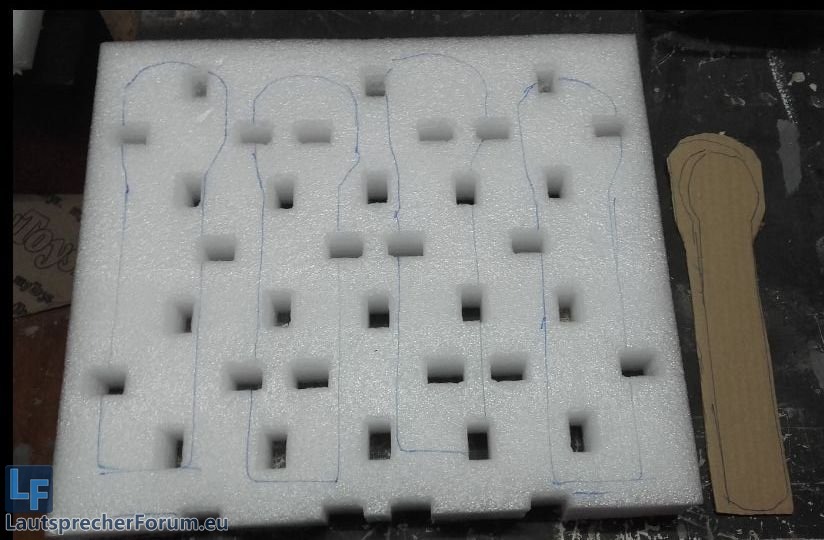Ergebnis: Aus OSB gefertigte Platten, rundum etwas größer als die Stand/Deckelfläche, damit noch etwas Schaumstoff zwischen Box und umfassender Konturkante hinpasst. Alle Platten wurden etwas abgeschrägt und diese Ecken dann direkt für Griffausschnitte genutzt.