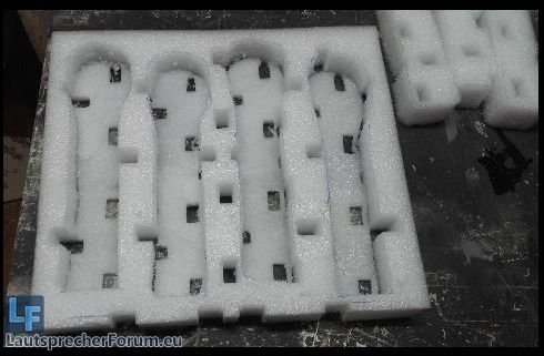 Es wurde Samstag schnell mal noch ein Protogehäuse mit versetzbarer Rückwand gebaut, um verschiedene Volumina auszuprobieren. Testvolumina waren etwa 63, 58, 50, 40, 36, 32, 28 Liter.
