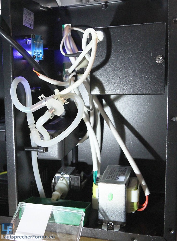 Wie man sieht, habe ich testweise den Schlauch vom Ausgang der Pumpe (unten links neben dem Trafo) abgezogen, um zu schauen, ob sie fördert. Man sieht, wie sich in dem weißen Anschluss etwas hin- und her bewegt (wahrscheinlich ein Ventil), das das Klopfen verursacht. Fördern tut die Pumpe allerdings nicht. Als nächstes werde ich testen, ob die Zuleitung zur Pumpe verstopft ist. Falls nein, wird die Pumpe defekt sein.