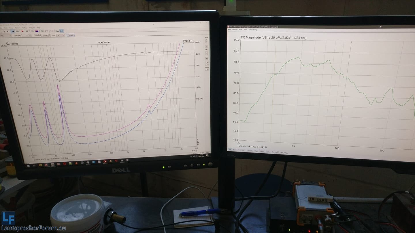 Erste Messung mit Test-Seitenwand: Tuning genau wie Simuliert, 37Hz+65Hz. (Pinke Impedanz -> nur eine VC)