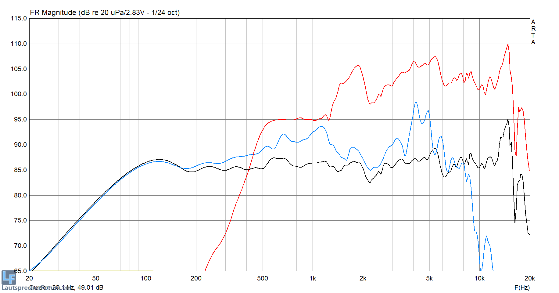 Kiste ist etwas leiser als die V1 geworden mit 86dB 1W/1m (ähnlich der V2), Belastbarkeit passt mit 100-120W aber soweit.