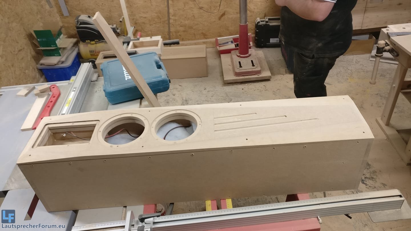 Die Schallwand wird dann einfach immer entsprechend eingeschoben, Hilfsklötzchen angeschraubt zum festklemmen und dann geht's direkt los.