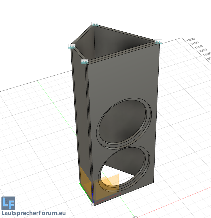 Als Topteil bestand die (zugegebenermaßen nicht ganz uninteressante) Idee, ein Gehäuse zu bauen, welches ohne gegenüberliegende Seiten / "Bretter" auskommt. Damit sollten gehäusetechnisch Stehwellen minimiert werden. Ob das der Fall ist, werden die Messungen zeigen, welche noch folgen werden.