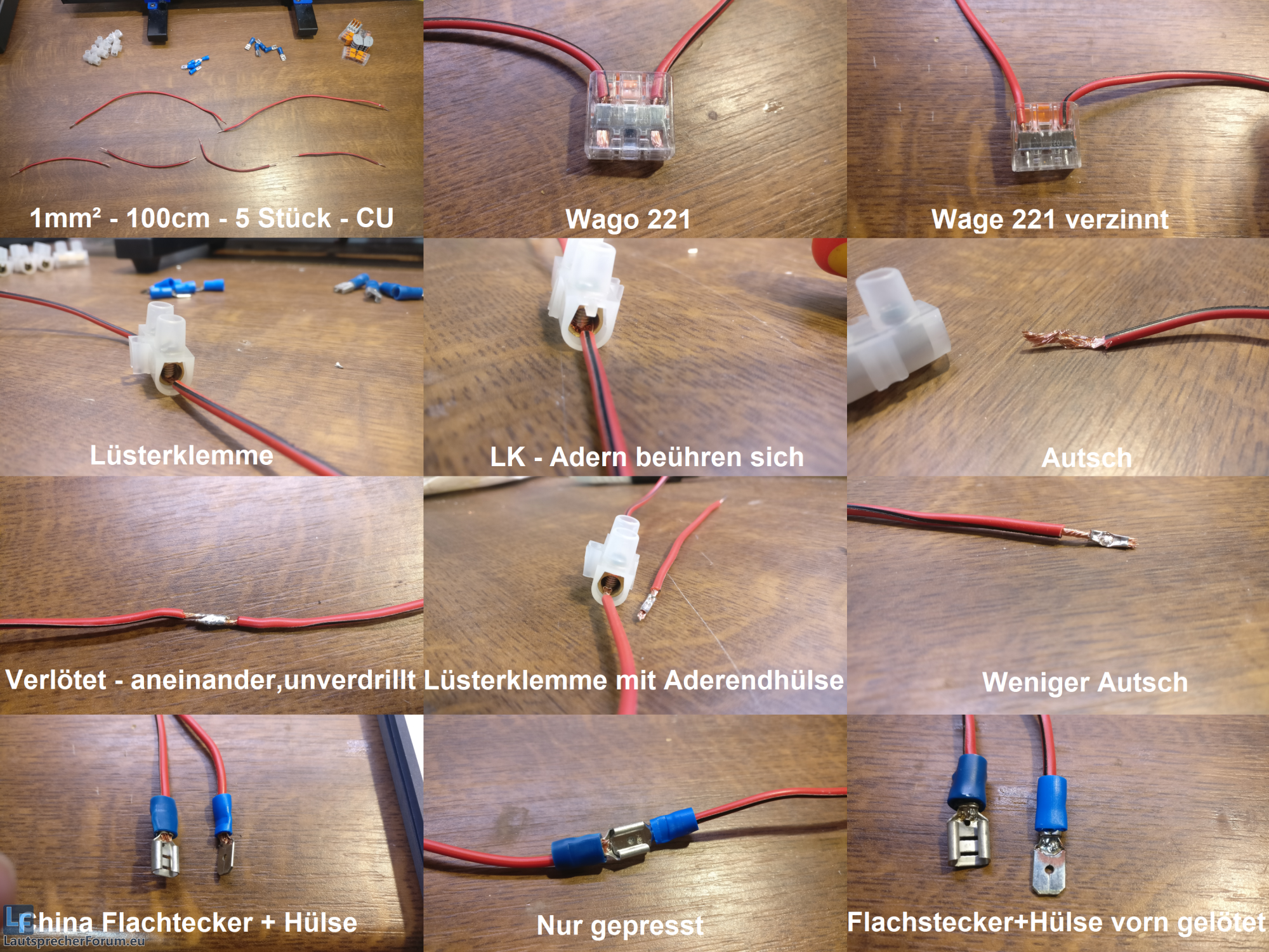 - Die hier verwendeten einfachen Lüsterklemmen müssen bei Litzen immer mit Aderendhülsen benutzt werden, verzinnen oder gar "roh" ist nicht erlaubt.