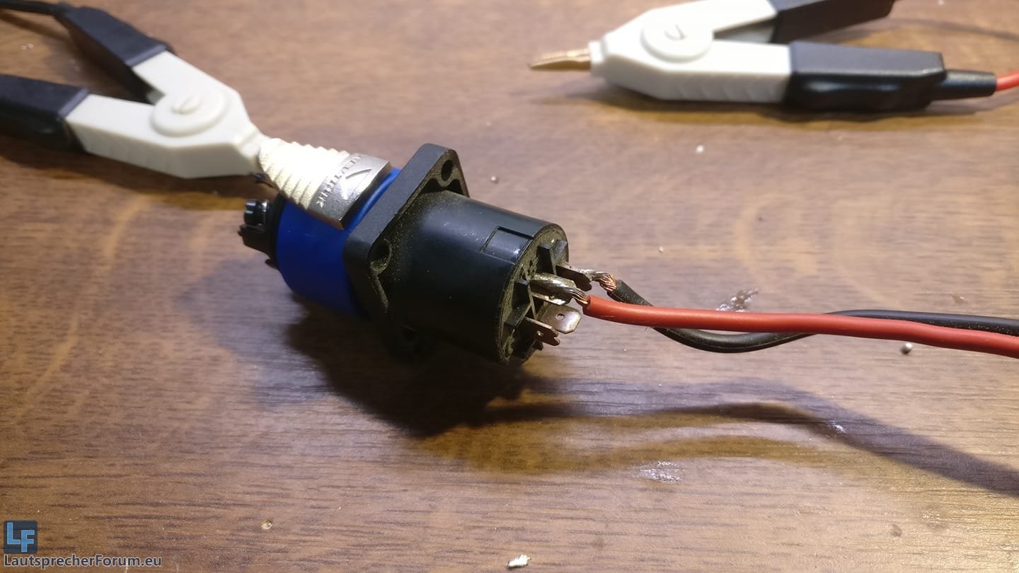 Bei Neutrik wurden die 25cm Litzen in den NL4FX Stecker verschraubt (später gelötet)