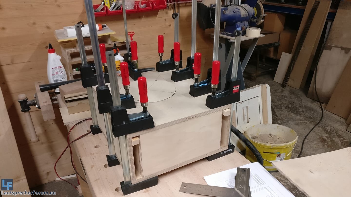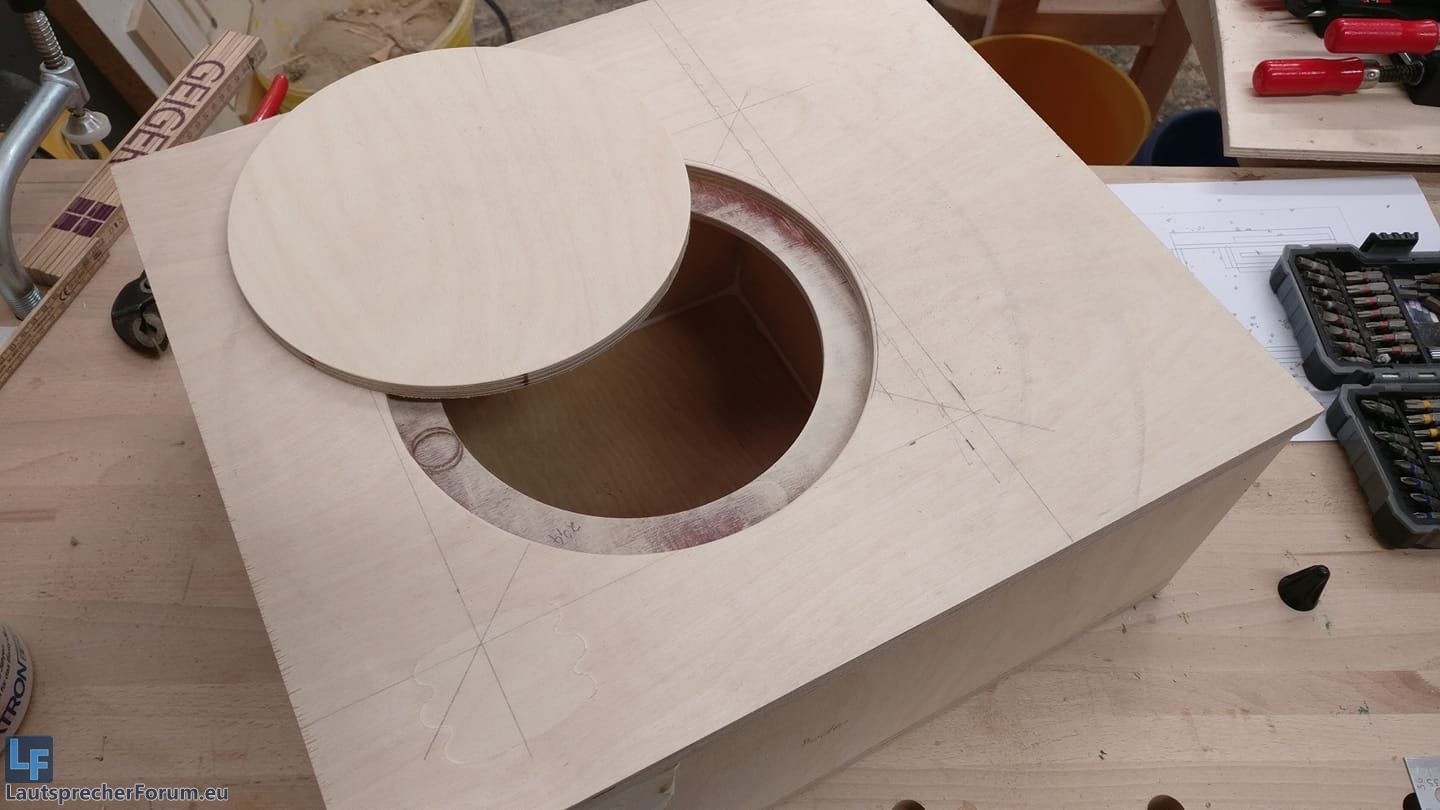 Also Proto-Seitenwand ab, noch Dämpfungswolle rein und finale Seitenwand drauf. (das Runde ist übrigens die Serviceklappe)