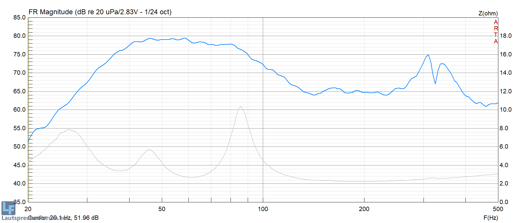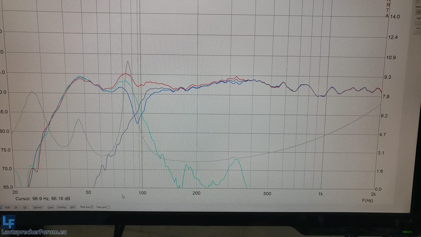 Erste Messung mit Test-Seitenwand: Tuning genau wie Simuliert, 37Hz+65Hz. (Pinke Impedanz -> nur eine VC)