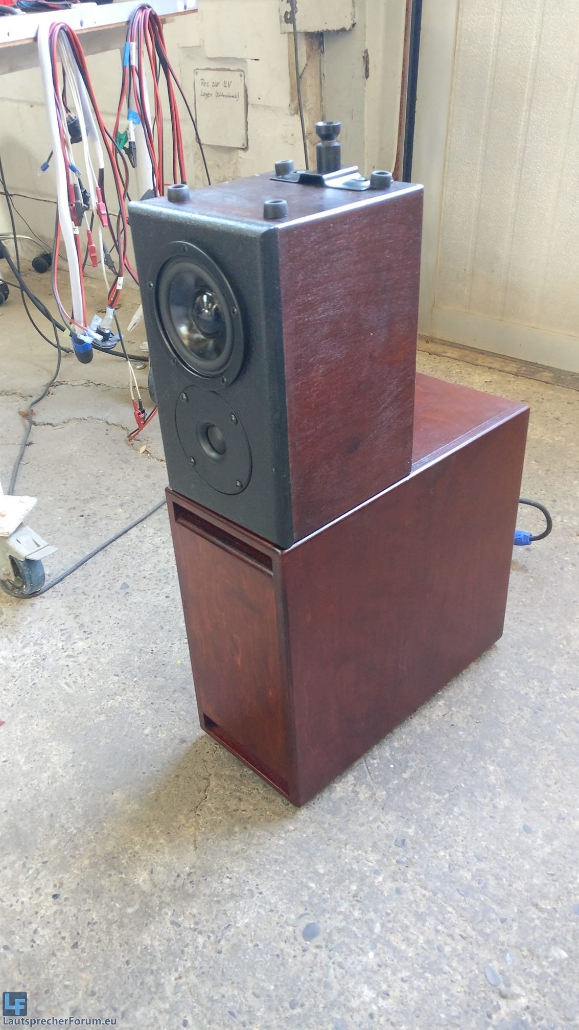 Bestückt mit Visaton W130X, nem kleinen 5"er (Außenmaß eher 6") mit Doppelschwingspule, 2x4 Ohm.