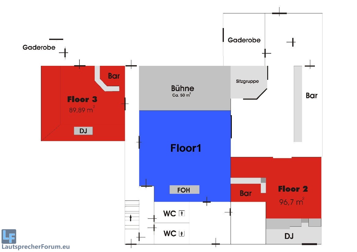 Für mich sieht der Floor 1 doch ne ganze Ecke größer aus als der Floor 3, außerdem kommt noch die Bühne dazu, wo man die Tops intelligenterweise draufstellen könnte. Grade um eine gleichmäßige Lautstärke über den Floor zu kriegen würde es ja sogar Sinn machen die Tops ganz ans Ende der Bühne zu stellen. Spart man sich auch den DJ Monitor