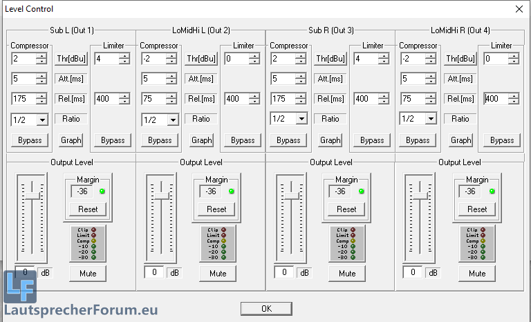 2.) RMS Limiter auf -3dB (500W) und Peaklimiter auf +3dB (2000W) kostet etwas Pegel, aber wir haben grob 6dB Dynamik übrig, sicherer wären aber +1,5dB Peak.