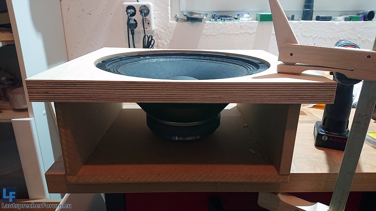 Hier muss man viele Löcher ziemlich präzise in die Schallwand bohren. Ich habe da am Anfang immer mit dem Zirkel den Lochkreis aufgezeichnet und dann die Positionen für die Löcher markiert. Neuerdings benutze ich eine Halterung für die Schallwand: