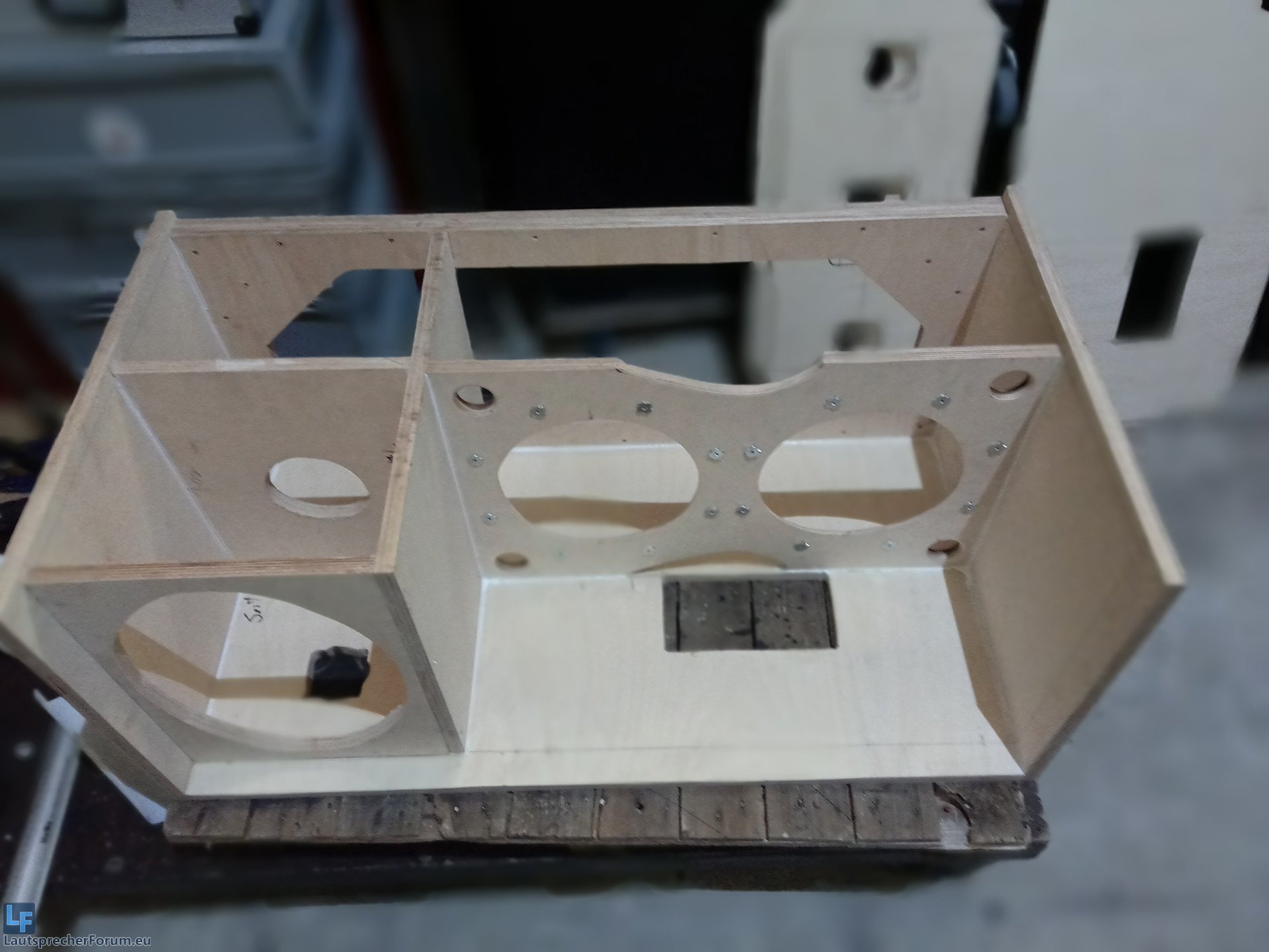 Für den Hochton habe ich hinter dem Horneinsatz noch ein zweites Brett angebracht, den dem der Treiber mit Gummis fixiert wird. Das hilft um dynamische Kräfte beim Transport abzufangen. Diesen Aufbau kennt sicher noch der ein oder andere von früher, als die HTs noch gute 15kg gewogen haben uglygaga: