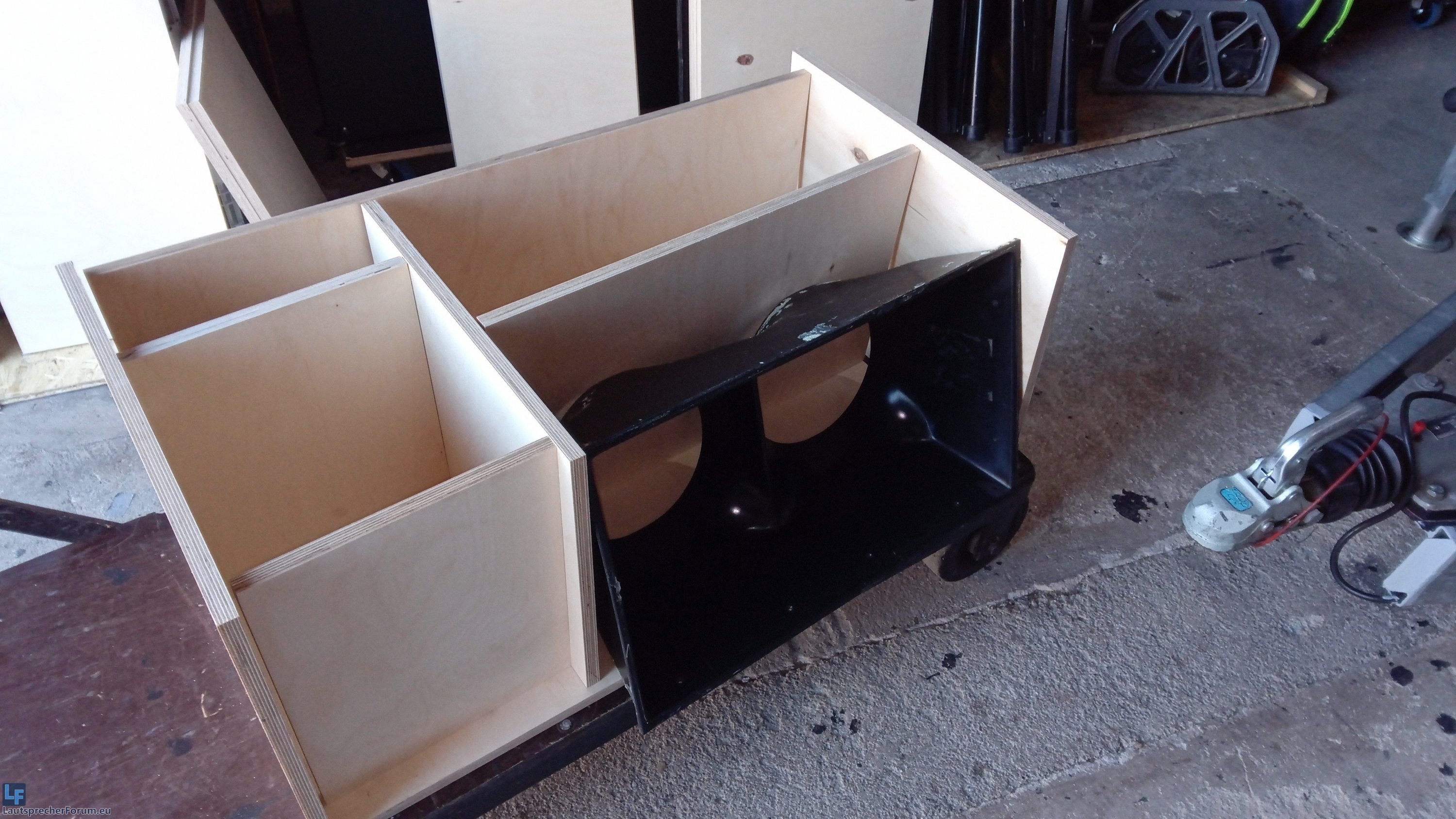 Für den Hochton habe ich hinter dem Horneinsatz noch ein zweites Brett angebracht, den dem der Treiber mit Gummis fixiert wird. Das hilft um dynamische Kräfte beim Transport abzufangen. Diesen Aufbau kennt sicher noch der ein oder andere von früher, als die HTs noch gute 15kg gewogen haben uglygaga: