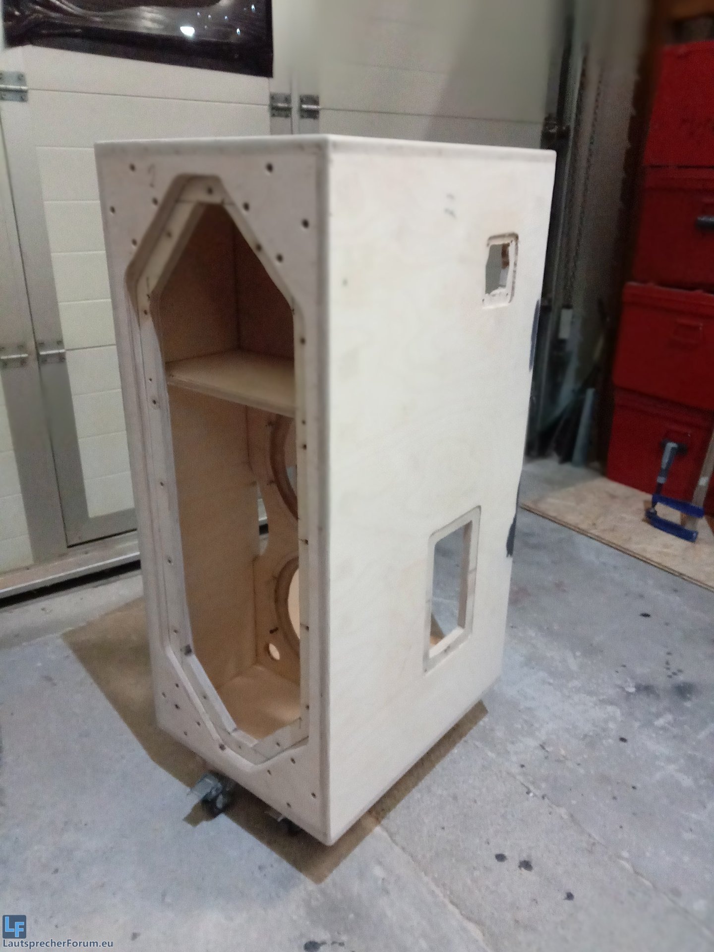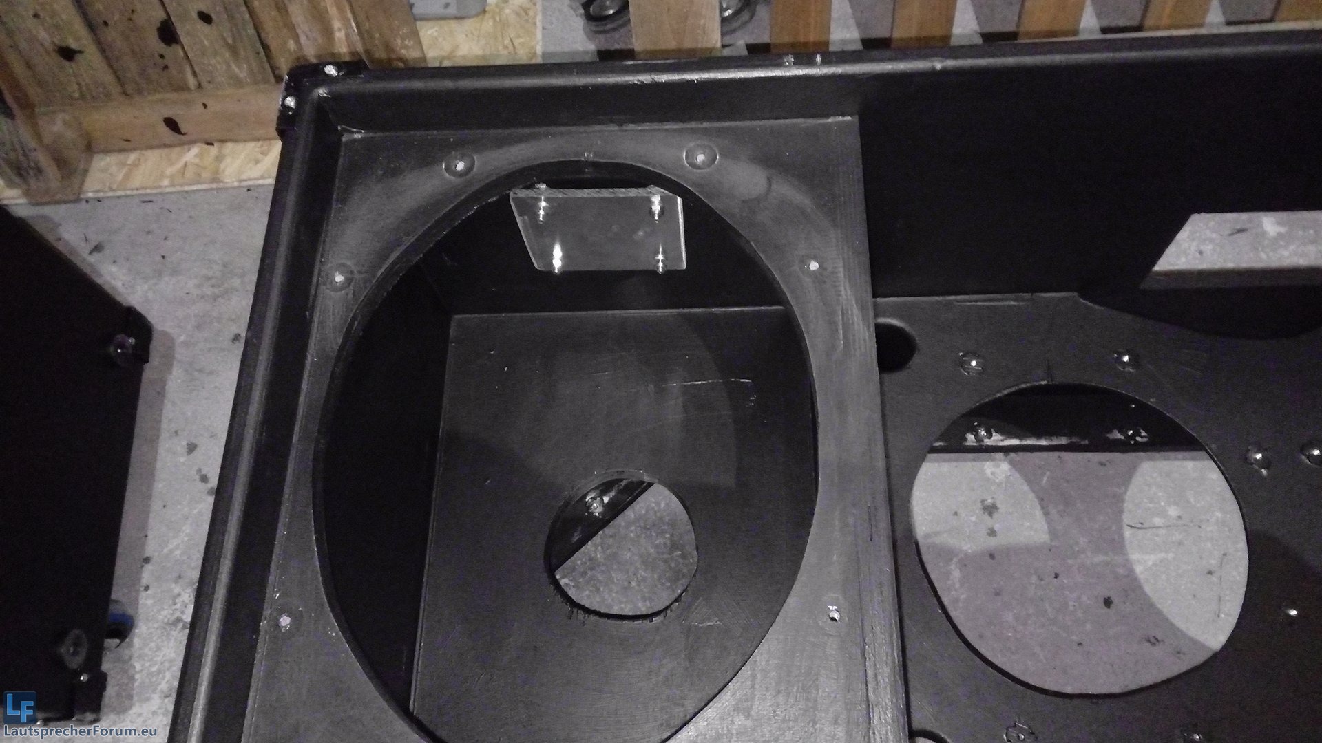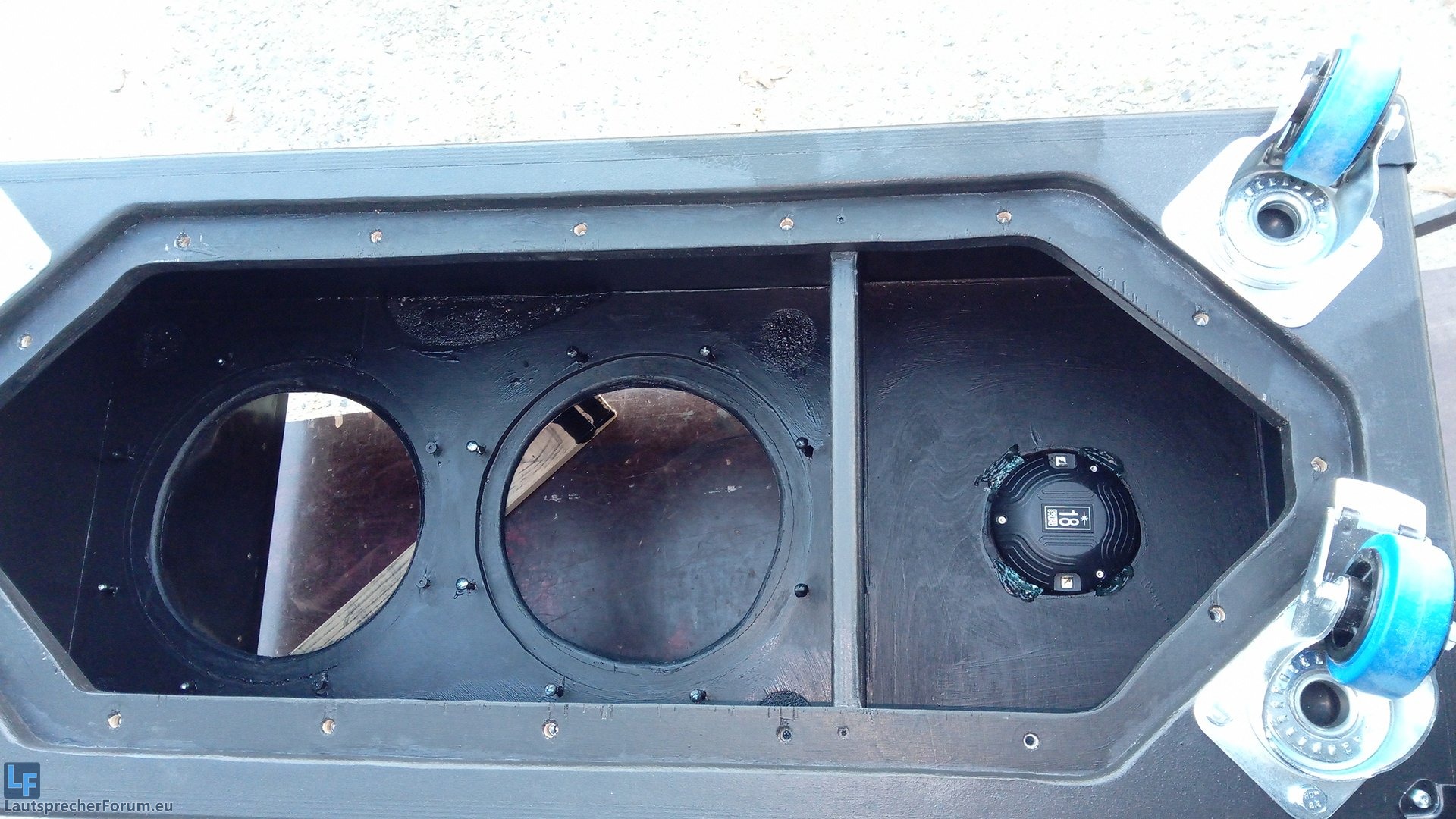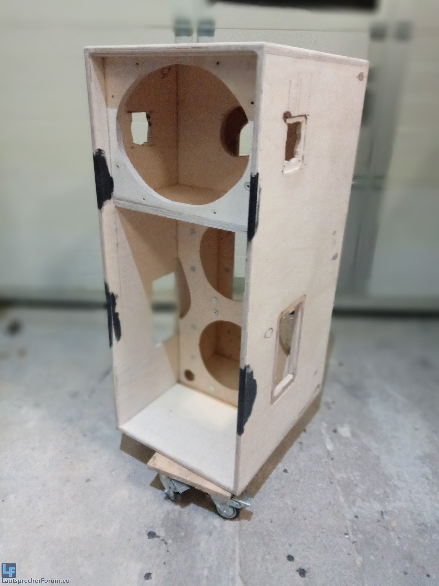 Die Gehäuse sind nun nochmal gefräst und geschliffen worden. Vor dem lackieren habe ich vier Streifen Warnex gesetz, wo der Lautsprecher zum trocknen später aufliegen wird: