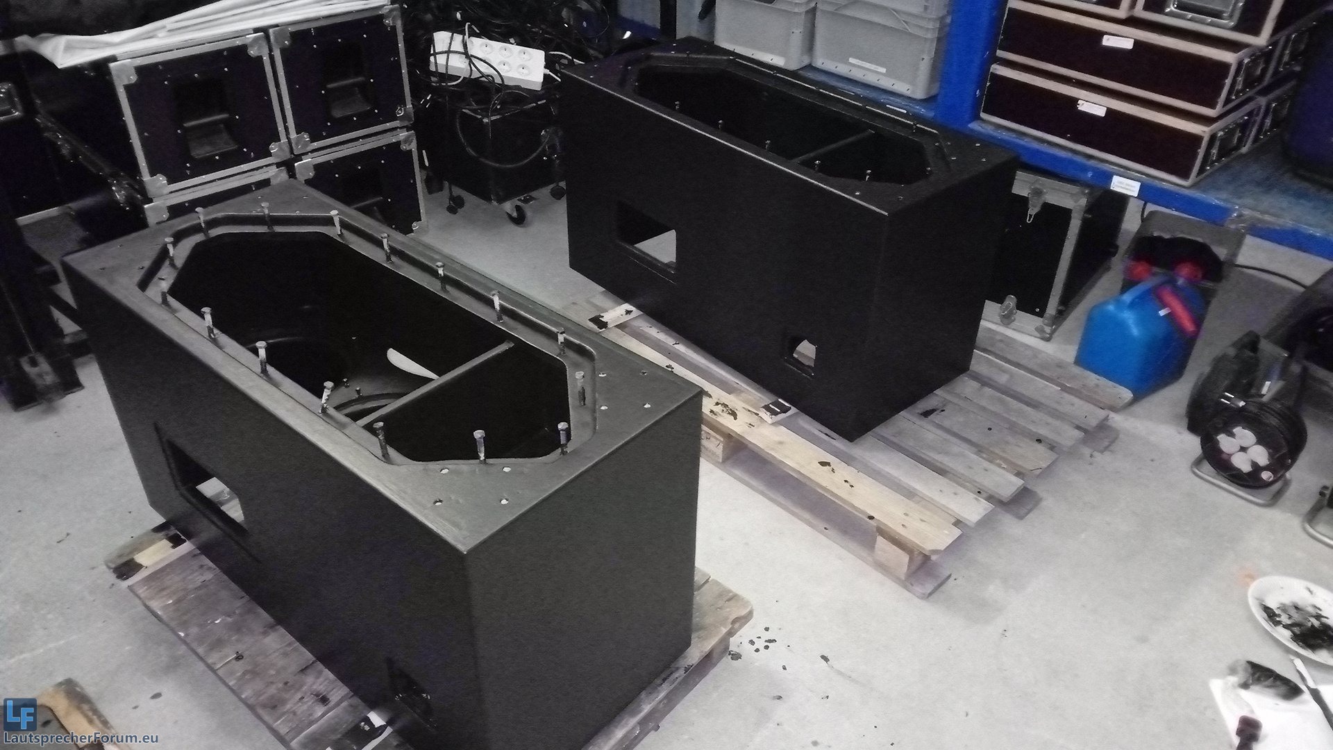 Ich würde das anders machen. Die Rollen auf der Rückseite sind eh nicht prall, da muss man sich blöd bücken beim Schieben. Außerdem rappeln die Rollen. Rollen raus, mit denen eine Rollbrett bauen für 1 od 2 der Kisten, formschlüssig. Da wo die Rollen waren, Flugösen dran. Ev. im Gehäuse das Dreieck hinter dem HT zumachen, da braucht man nicht so viel Platz f den HT. Und dann die Terminals auch auf das Gehäuse und nicht in die Rückwand. Was Ich mich schon über Anschlüsse auf der Serviceklappe geärgert habe! :grummel: