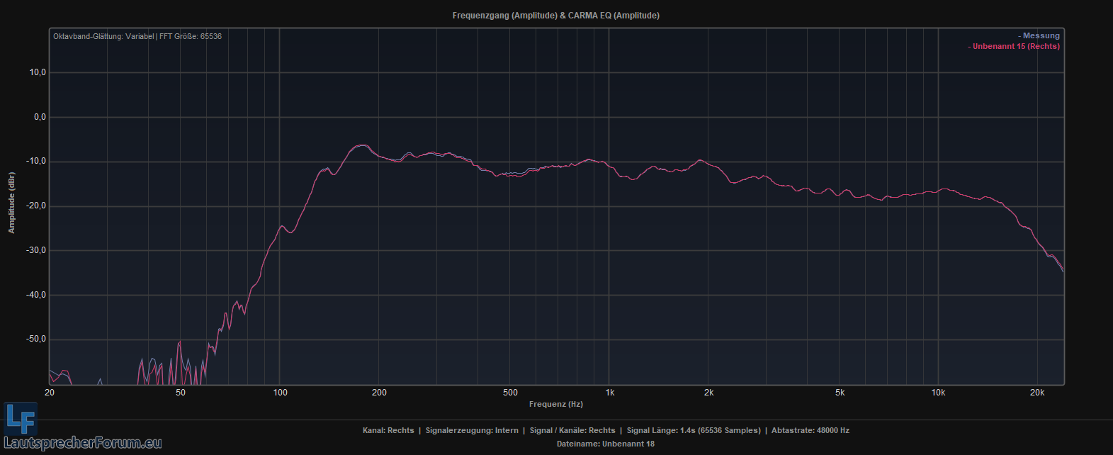 In der Messung habe ich vorsichtshalber mit BUT48 bei 200Hz getrennt! Der pinke Graf zeigt hierbei die Messung mit L-PAD und Kondensator, der gräuliche Graf ohne Trennung direkt am Verstärker. (Lautstärkeunterschiede von 5,5dB bereits ausgeglichen!)