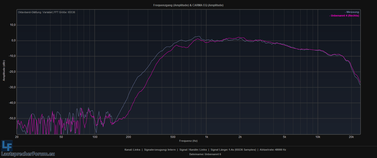 In der Messung habe ich vorsichtshalber mit BUT48 bei 200Hz getrennt! Der pinke Graf zeigt hierbei die Messung mit L-PAD und Kondensator, der gräuliche Graf ohne Trennung direkt am Verstärker. (Lautstärkeunterschiede von 5,5dB bereits ausgeglichen!)
