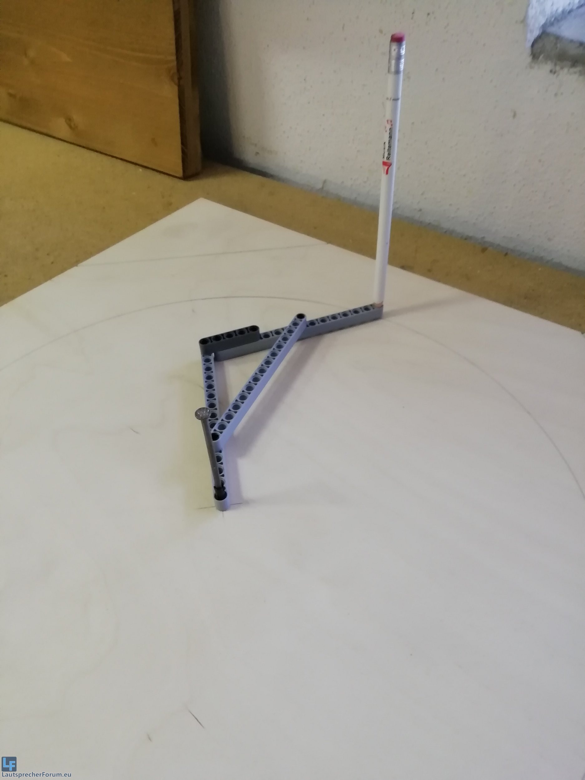 Ich hatte kein Zirkel da. Dann war ich etwas kreativ und hab kurzerhand drei alte Lego Technik Teile zweckentfremdet und passend eingestellt. Ich muss sagen hat sehr gut funktioniert besser als wie ne Schnur mit nem Stift (hab ich auch Probiert).