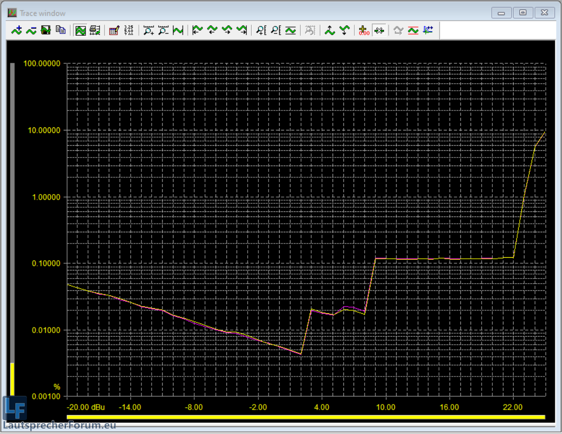 (1) Maximum sauber 8.82dBu, Absolutes Maximum sind 8.84dBu, aber hier steigt das THD massiv