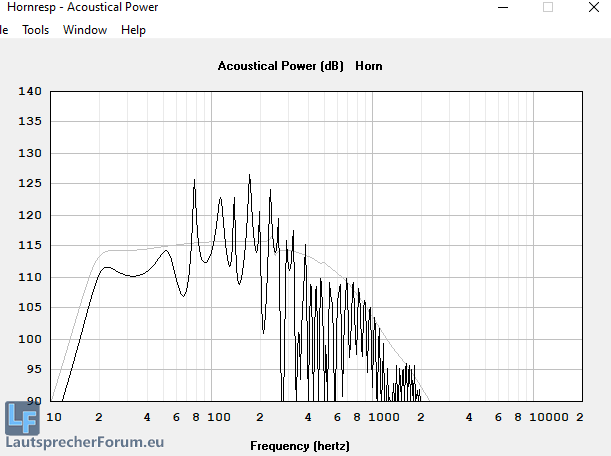 Das zweite Horn kommt nicht viel tiefer als das Pal12 daher habe ich das einfach mal weg gelassen. Das andere wiederum hat natürlich eine enorme Hornlänge und kommt der Simu nach wirklich bis 20hz. Ich habe mal eine Standard BR Kiste mit 100l und 20hz Tuning drüber gelegt zum Vergleichen.