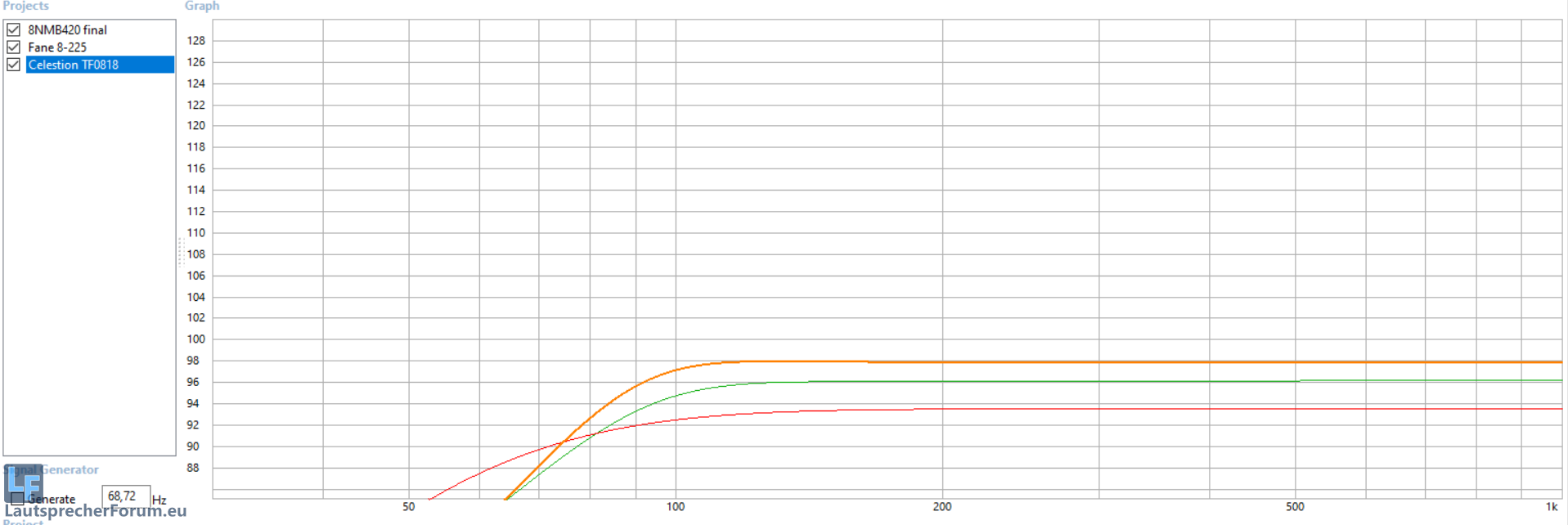 Den Sica bekomme ich nicht besser als den Celestion abgestimmt. Aber der 8NMB... 14 l mit 85 Hz sieht sehr gut aus. Gibt es den auch in Ferro? Ich denke, den werde ich für das Projekt nehmen. Davor muss ich nochmal den Subwoofer messen, ob ich bei 110 Hz noch gut trennen kann.